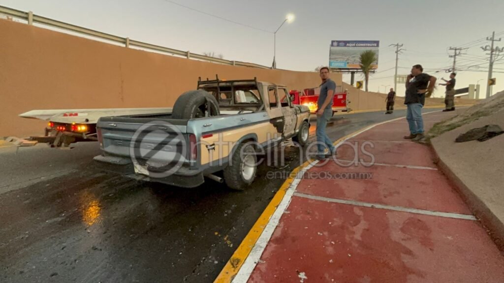 Chihuahua.- La tarde de este martes se registró un fuerte incendio vehicular en la rampa de acceso que conecta la avenida Teófilo Borunda con el Periférico de la Juventud, en sentido de sur a norte, luego de que una pickup Ford Ranger de modelo atrasado comenzara a arder en llamas.