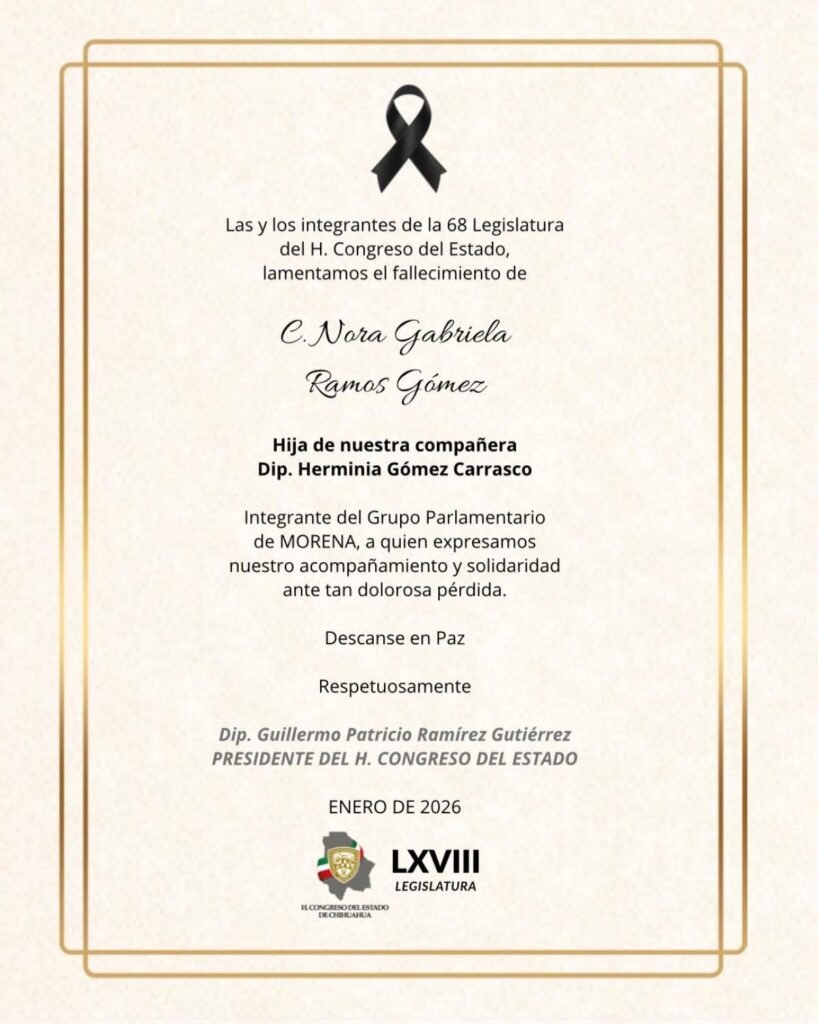 A través de una esquela firmada por el presidente del Congreso, Guillermo Ramírez, así como por los integrantes de la 68 Legislatura, se informó del fallecimiento de Nora Ramos Gómez.