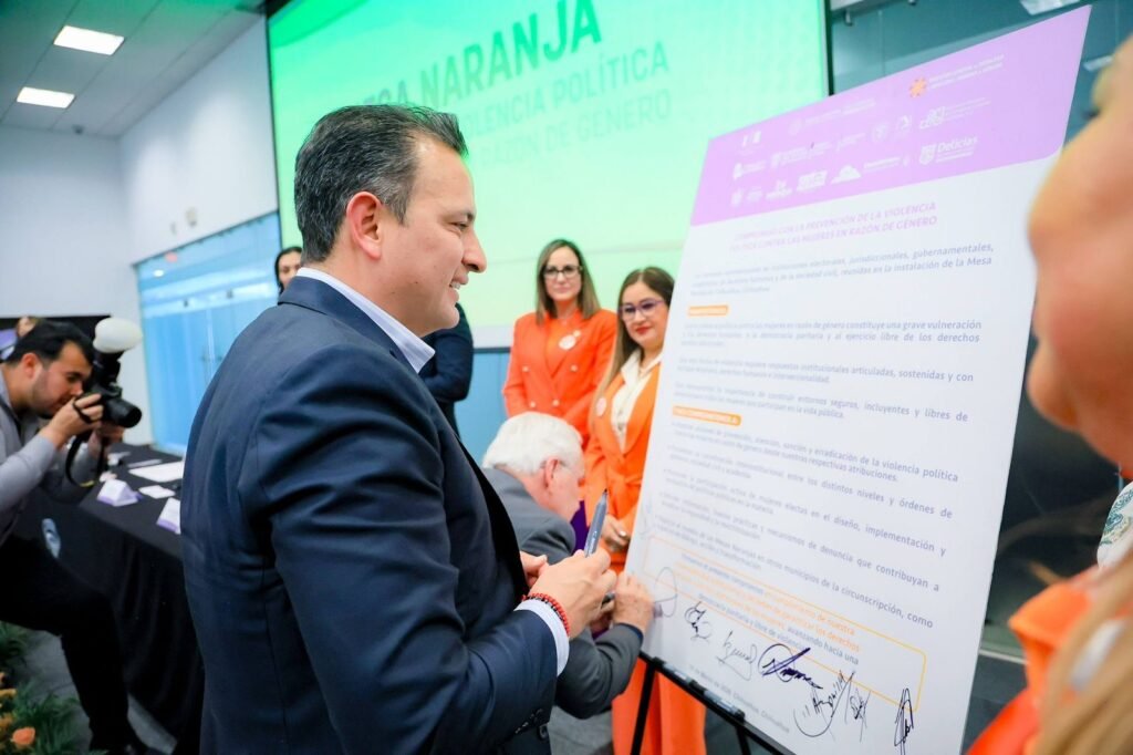 H. Ciudad de Chihuahua, Chih., a 10 de marzo de 2026.- El alcalde Marco Bonilla participó en la firma para la instalación de la quinta Mesa Naranja, un organismo que reúne a diversas instituciones con el objetivo de trabajar de manera coordinada en la prevención, atención y erradicación de la violencia política contra las mujeres en razón de género.