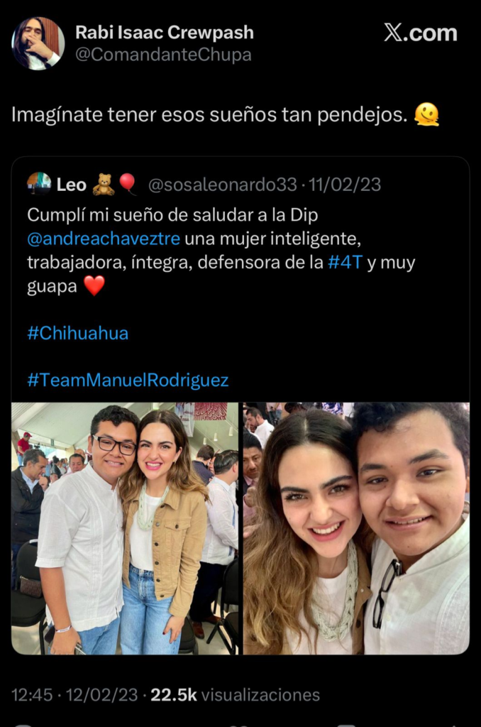 Cabe destacar que del personaje que mencionó la regidora, es Adrián Sánchez, también se le vio involucrado reposteando comentarios donde aparece la senadora Andrea Chávez, a quien recientemente un funcionario del Municipio de Chihuahua, ya cesado, le hizo comentario misógino.