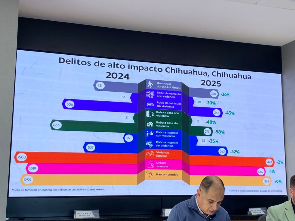De los delitos de alto impacto presentados para la ciudad de Chihuahua, destaca que, en su totalidad, presentaron disminución. El homicidio doloso bajó un 26% pasando de 431 víctimas en 2024 a 320 al cierre de 2025 según la información preliminar de la Fiscalía general del Estado; de igual manera, los delitos de robo a vehículo con y sin violencia tuvieron una disminución del 30 y 43%, respectivamente pasando de 54 a 38 hechos y 606 a 348 comparando 2024 a 2025.