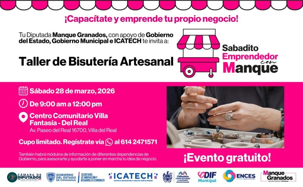 Con el objetivo de impulsar el emprendimiento y fortalecer la economía familiar en las colonias de Chihuahua Capital, la diputada federal Manque Granados invita a los vecinos de Villas del Real, y colonias aledañas, a la segunda edición del programa “Sabadito Emprendedor”, que ofrecerá una capacitación gratuita de Bisutería Artesanal.