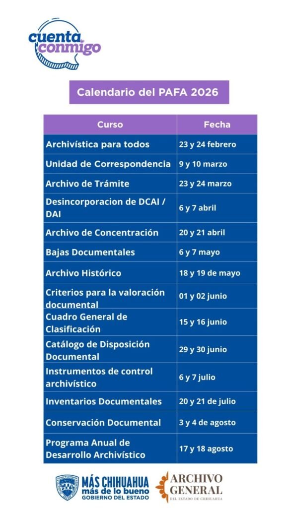 Con el objetivo de fortalecer la gestión documental en las instituciones públicas del estado, el Archivo General del Estado de Chihuahua (AGECh) anunció la implementación del Programa Anual de Formación Archivística (PAFA) 2026, dirigido a las y los funcionarios públicos que laboran en la Coordinación de Archivos de los Sujetos Obligados.