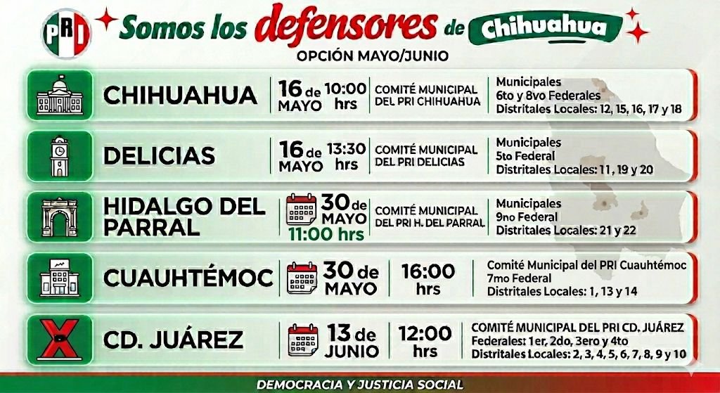 El Comité Directivo Estatal (CDE) del PRI informó de las fechas oficiales para realizar los registros de los llamados “defensores”, tanto en las 67 alcaldías, nueve distritos federales y 22 distritos locales, los cuales comenzarán el próximo 16 de mayo.