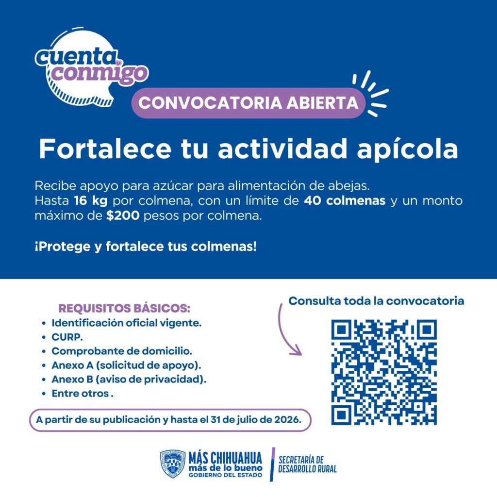 Este beneficio forma parte del esquema de Apoyo para Insumos Pecuarios del programa “Cuenta Conmigo en el Campo”, que busca respaldar a las y los apicultores chihuahuenses, fortalecer la producción apícola y contribuir a su cuidado y mejora en la entidad.