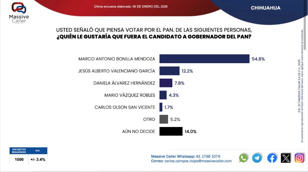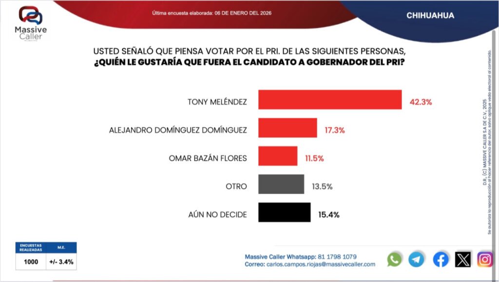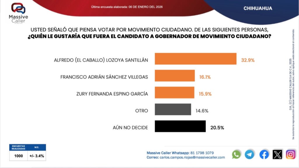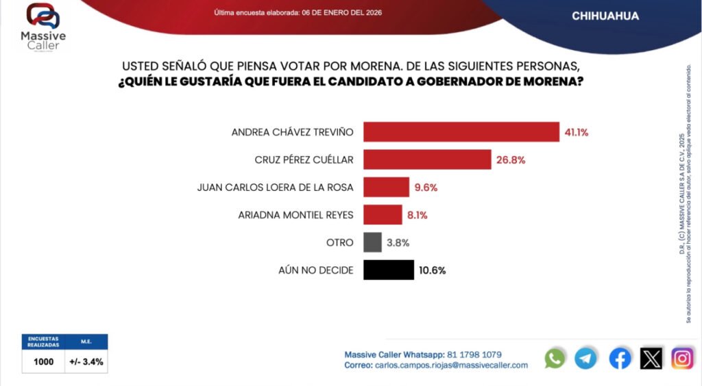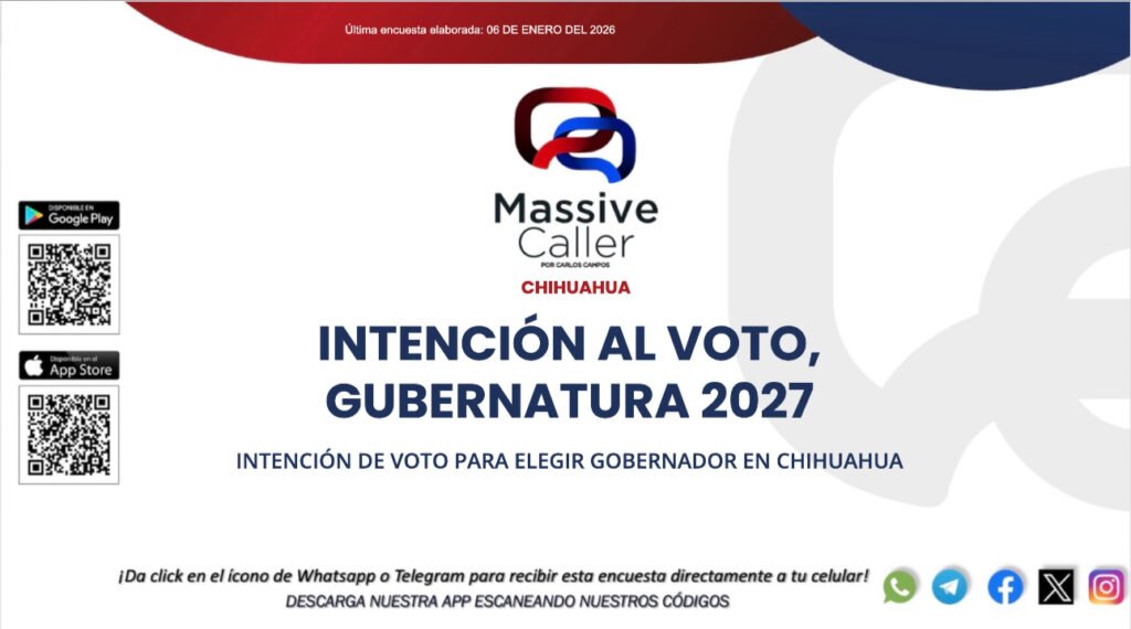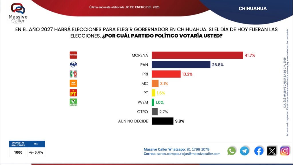 Massive Caller publicó la mañana de este miércoles 7 de enero su última encuesta por la gubernatura de Chihuahua, la cual estará en juego en el 2027, en donde Morena como partido político encabeza las preferencias electorales.