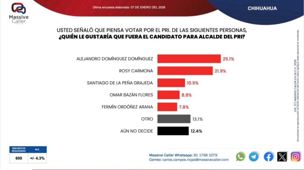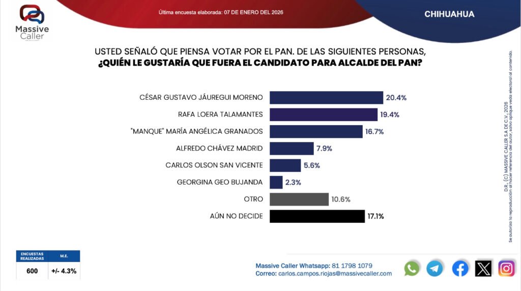 La más reciente encuesta de Massive Caller por la alcaldía de Chihuahua capital, reveló que el PAN como partido político sigue en primer lugar en las preferencias electorales, seguido por Morena y el PRI en tercer lugar.