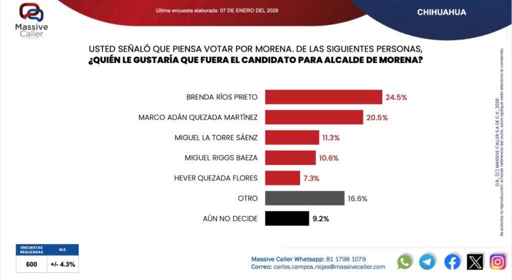 Respeto a la candidatura de Morena, la diputada local Brenda Ríos está en primer lugar, con el 24.5 por ciento y en segundo lugar el exalcalde y expriista Marco Quezada, con el 20.5 por ciento, seguidos por el expanista Miguel La Torre, el regidor Miguel Riggs y el funcionario federal Hever Quezada.