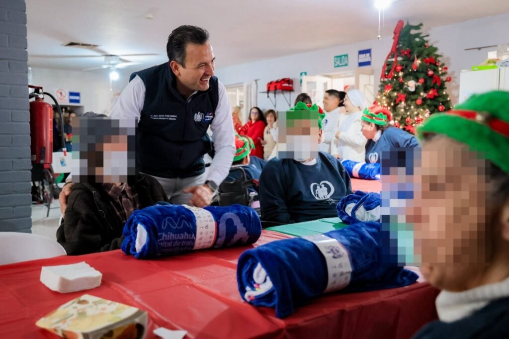 H. Ciudad de Chihuahua, Chih., a 25 de diciembre de 2025.- El alcalde Marco Bonilla y la presidenta del DIF Municipal Karina Olivas, llevaron alimentos y actividades recreativas a los abuelos del asilo Bocado del Pobre, como parte de las actividades que cada año realizan por la Navidad.