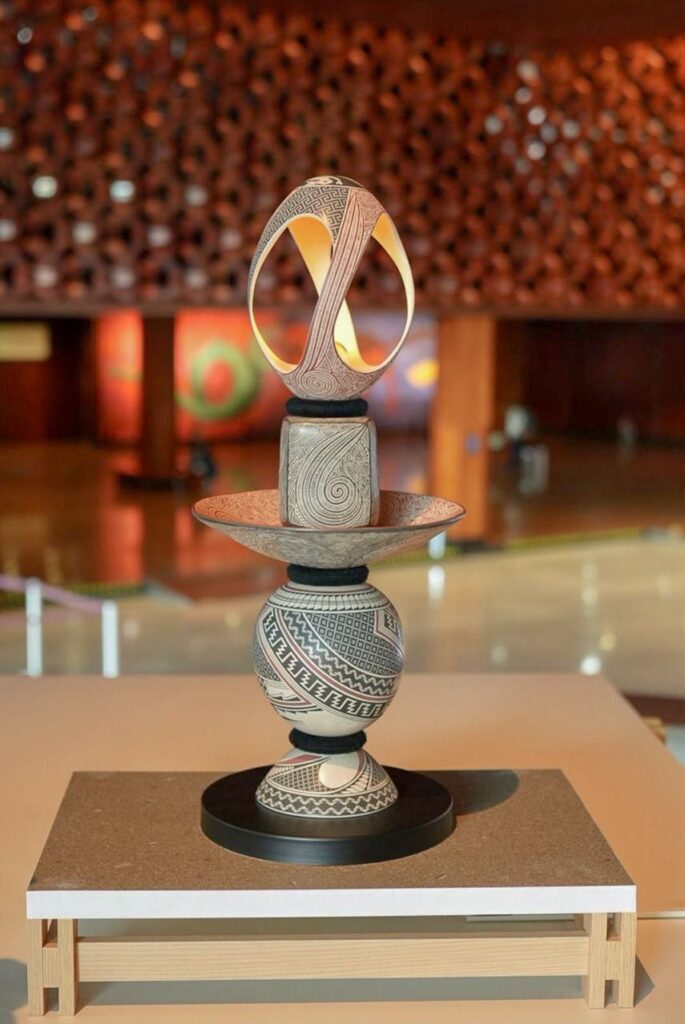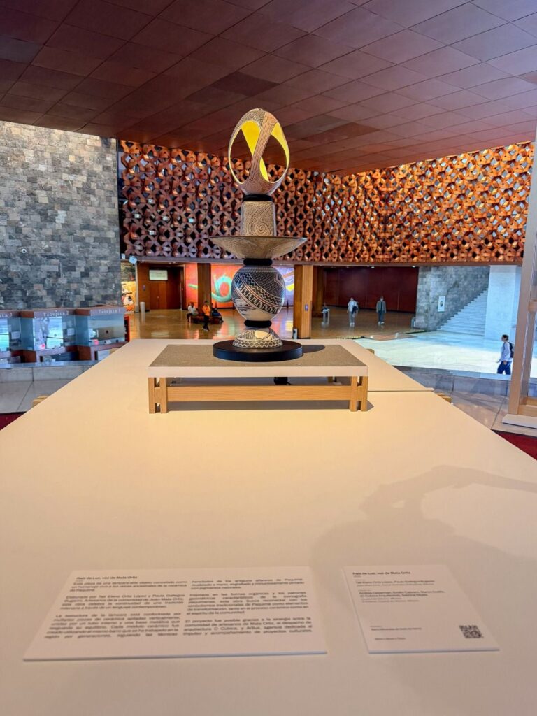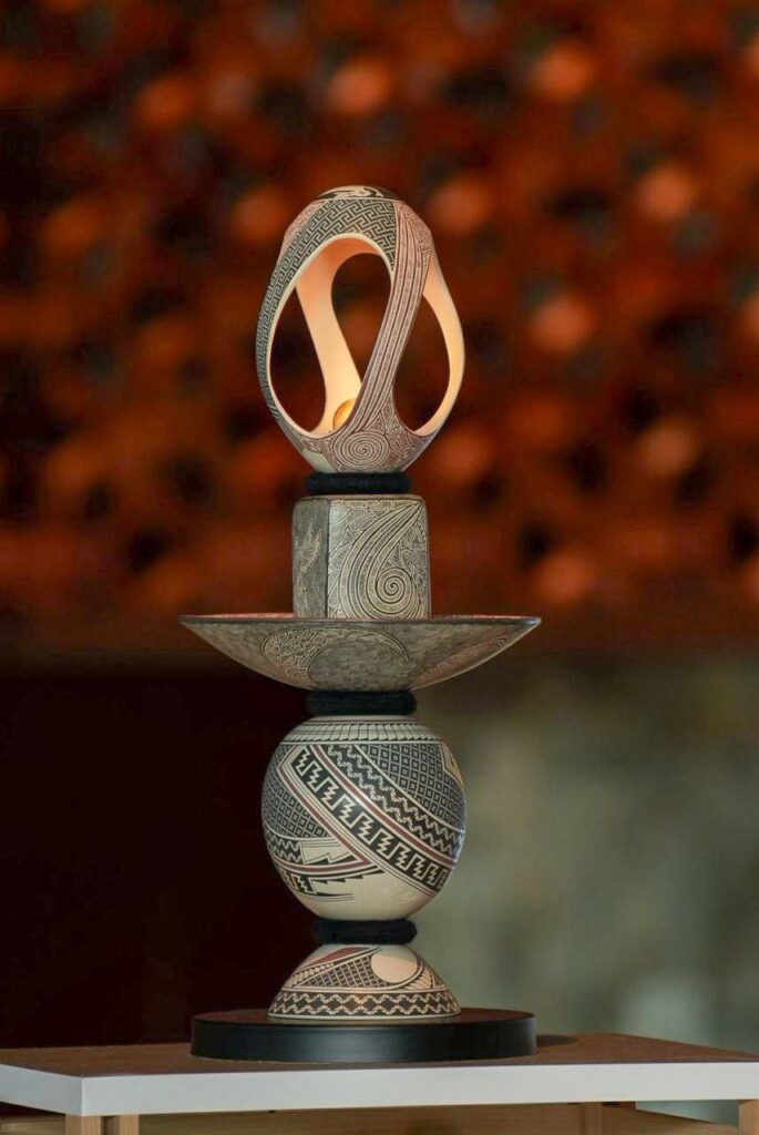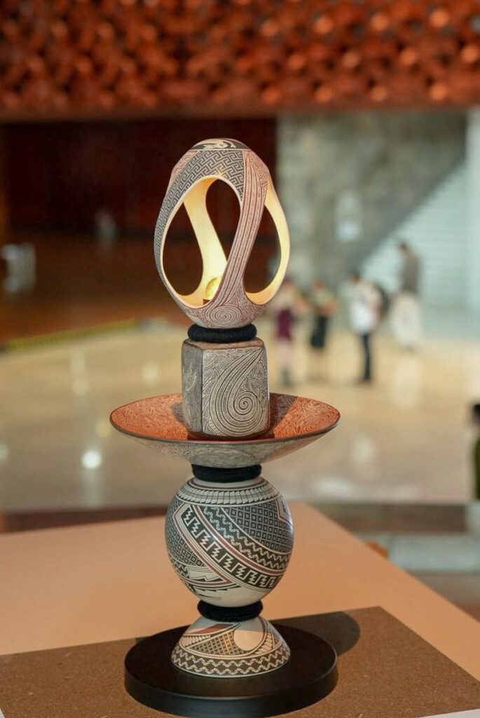 La pieza titulada “Raíz de luz, voz de Mata Ortiz”, está conformada por cinco elementos elaborados con distintas técnicas (dos de cada artesana y una sección central creada en conjunto), que representan la unión entre tradición, diseño contemporáneo e identidad cultural.