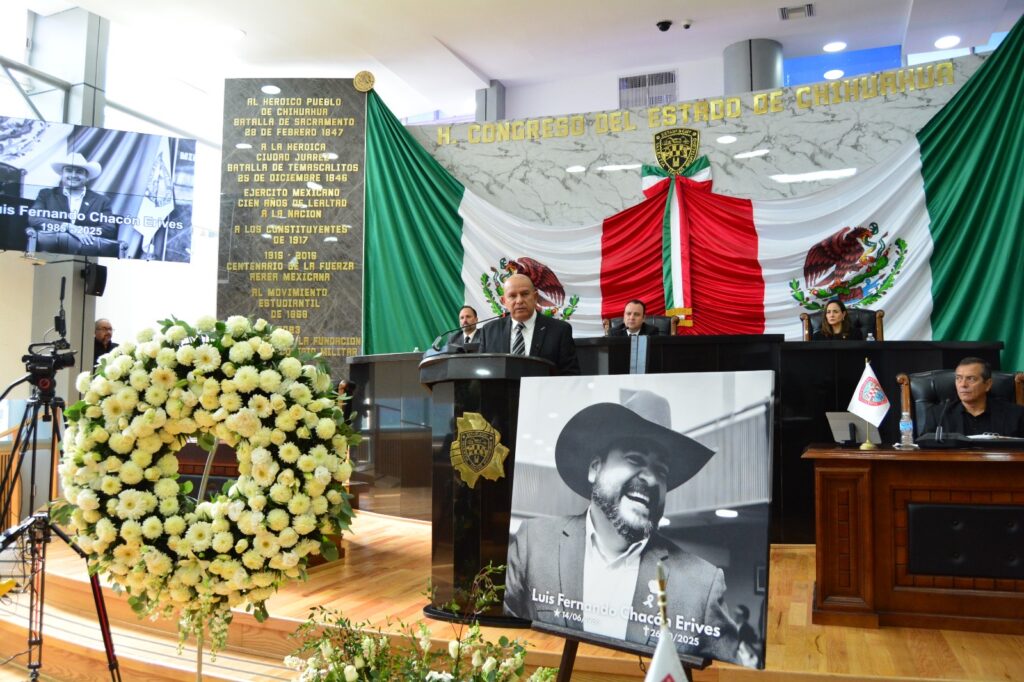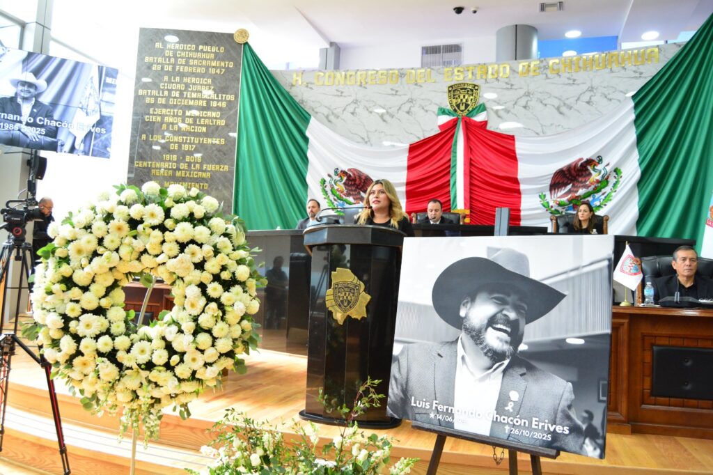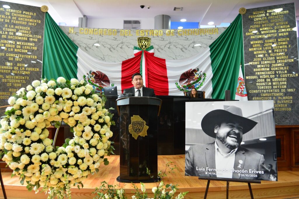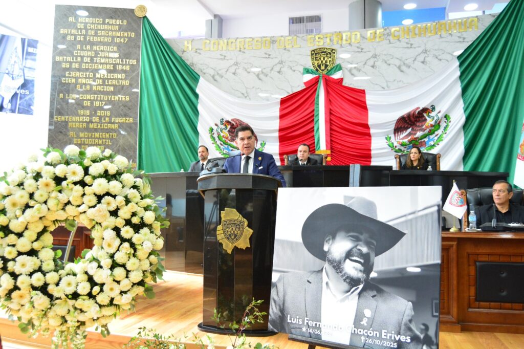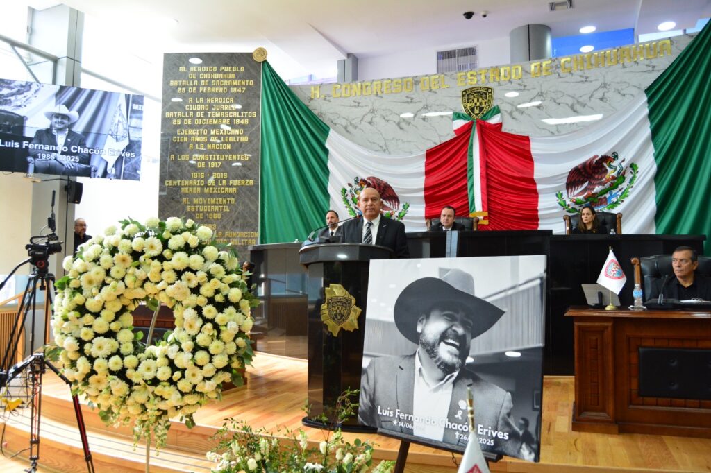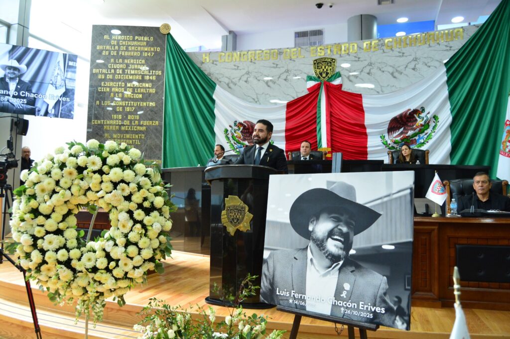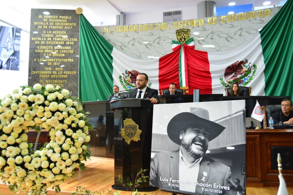 Este 28 de octubre, el Congreso del Estado de Chihuahua, llevó a cabo Sesión Solemne de Homenaje Póstumo en memoria del diputado Luis Fernando Chacón Erives, representante del distrito 13 con cabecera en Guerrero; distinguido legislador, servidor público y ser humano comprometido con el sector ganadero y el campo chihuahuense, siempre entregado a su comunidad. El acto solemne estuvo encabezado por representantes de los Tres Poderes del Estado.
