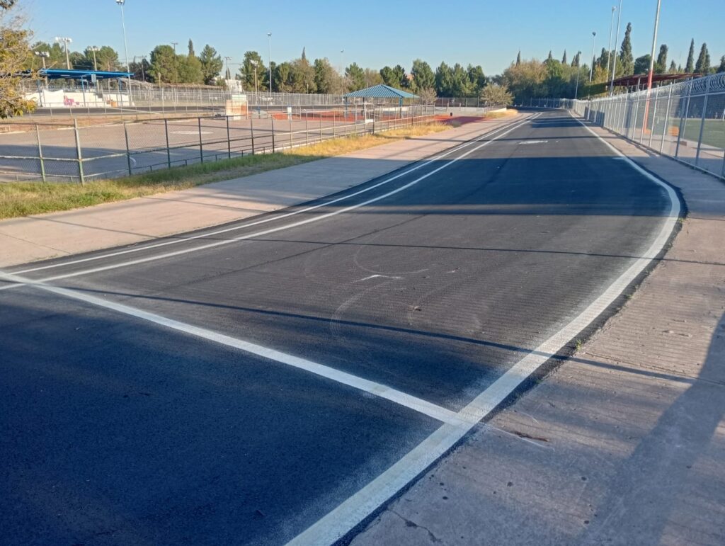 El proyecto contempló trabajos de rehabilitación de concreto asfáltico, de gradas, palapa y podio, además de la instalación de una malla ciclónica perimetral, rehabilitación de pintura y la instalación de 28 luminarias.