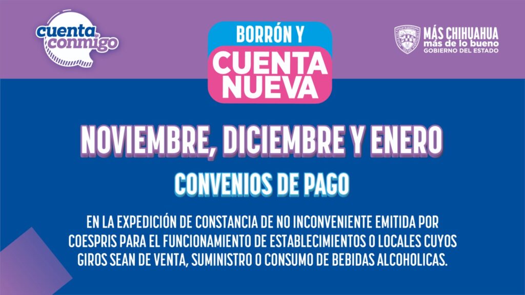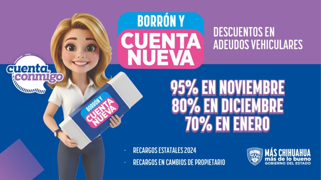 < El Gobierno del Estado de Chihuahua arrancó a partir de este miércoles 22 de octubre el programa Borrón y Cuenta Nueva en su edición 2025, con el fin de que las y los contribuyentes puedan ponerse al corriente en sus pagos vehiculares y de impuestos estatales, renovación de licencias de tránsito, de transporte y de gobernación.