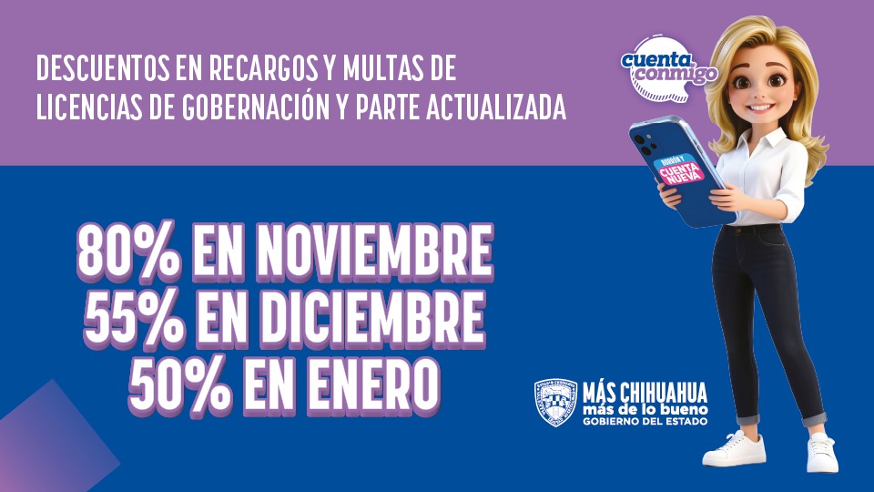 Todos los descuentos ya se encuentran cargados en el sistema a partir de este miércoles 22 de octubre en las recaudaciones de rentas, en la página de ipagos.chihuahua.gob.mx, en los kioscos de pagos digitales, en la página de Facebook.com/ShGobChih y a través del número oficial de whatsapp (614) 372-17-00.