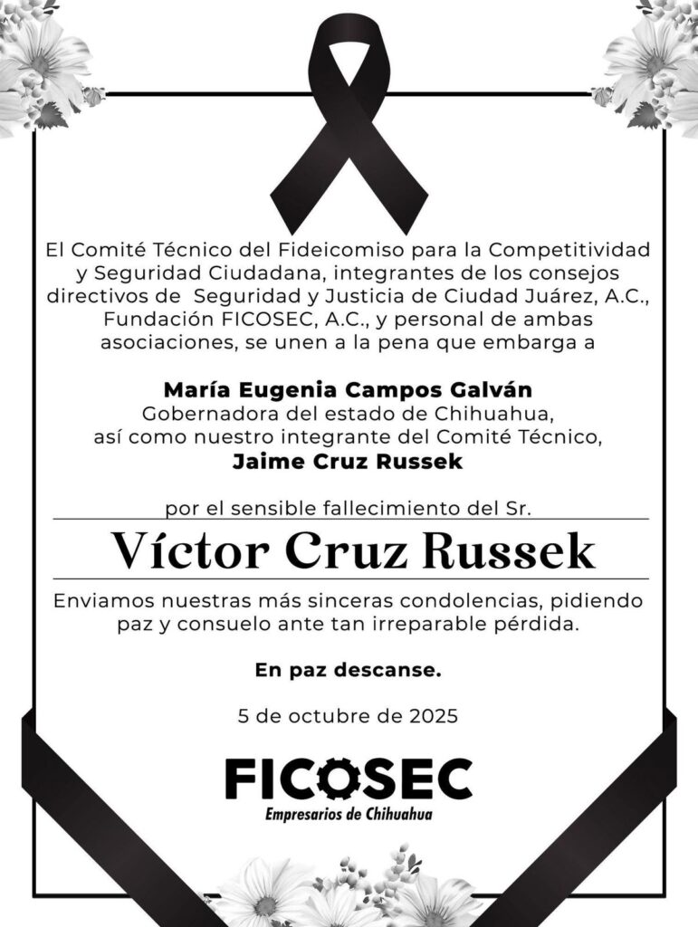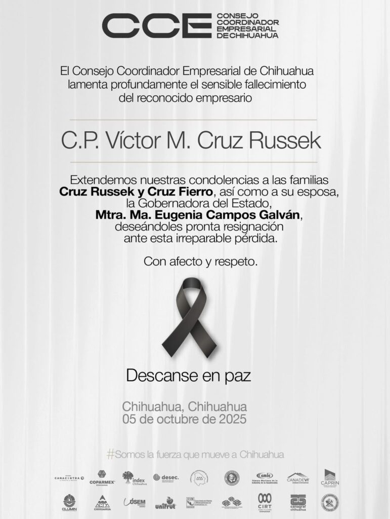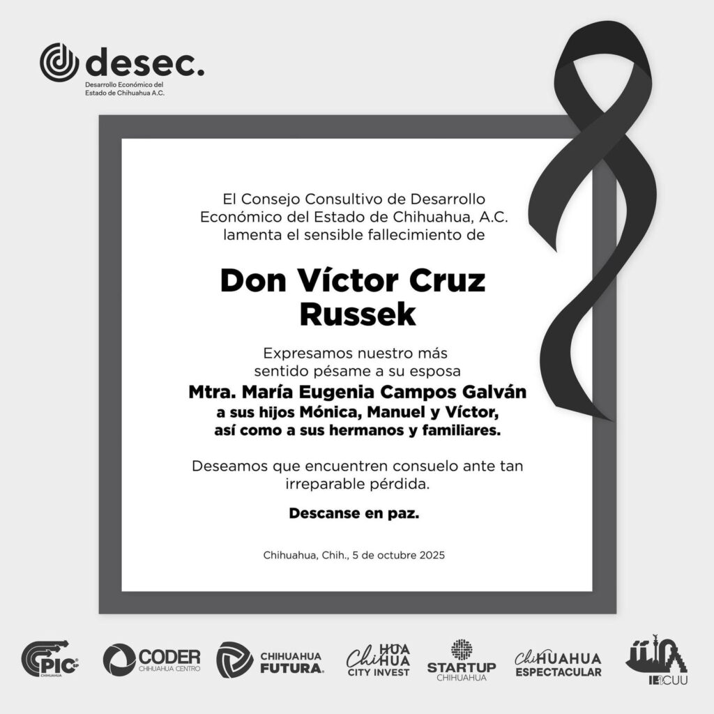 Desarrollo Económico del Estado de Chihuahua (DESEC) liderado por Jorge Cruz Camberos, sobrino del Don Víctor Cruz, se unieron a la pena y se suman a la solidaridad con la familia.
