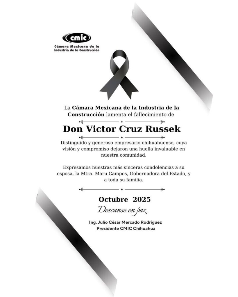 La Cámara Mexicana de la Industria de la Construcción, líderada por Julio César Mercado Rodríguez, lamentaron el fallecimiento del distinguido y generoso empresario, inborrable para Chihuahua.