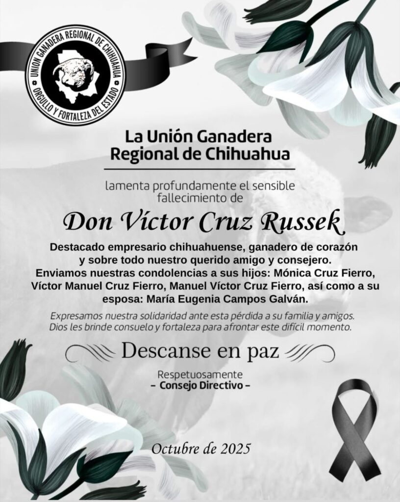 Por su parte la Unión Ganadera Regional de Chihuahua (UGRCH) encabezada por Álvaro Bustillos Fuentes destacó un despido a una persona admirable a quien se le reconoce su calidad humana, quien estuvo activo en actividades filantrópicas y financieras, Don Víctor Cruz tomo protesta a principios de este año como parte del consejo de la UGRCH.
