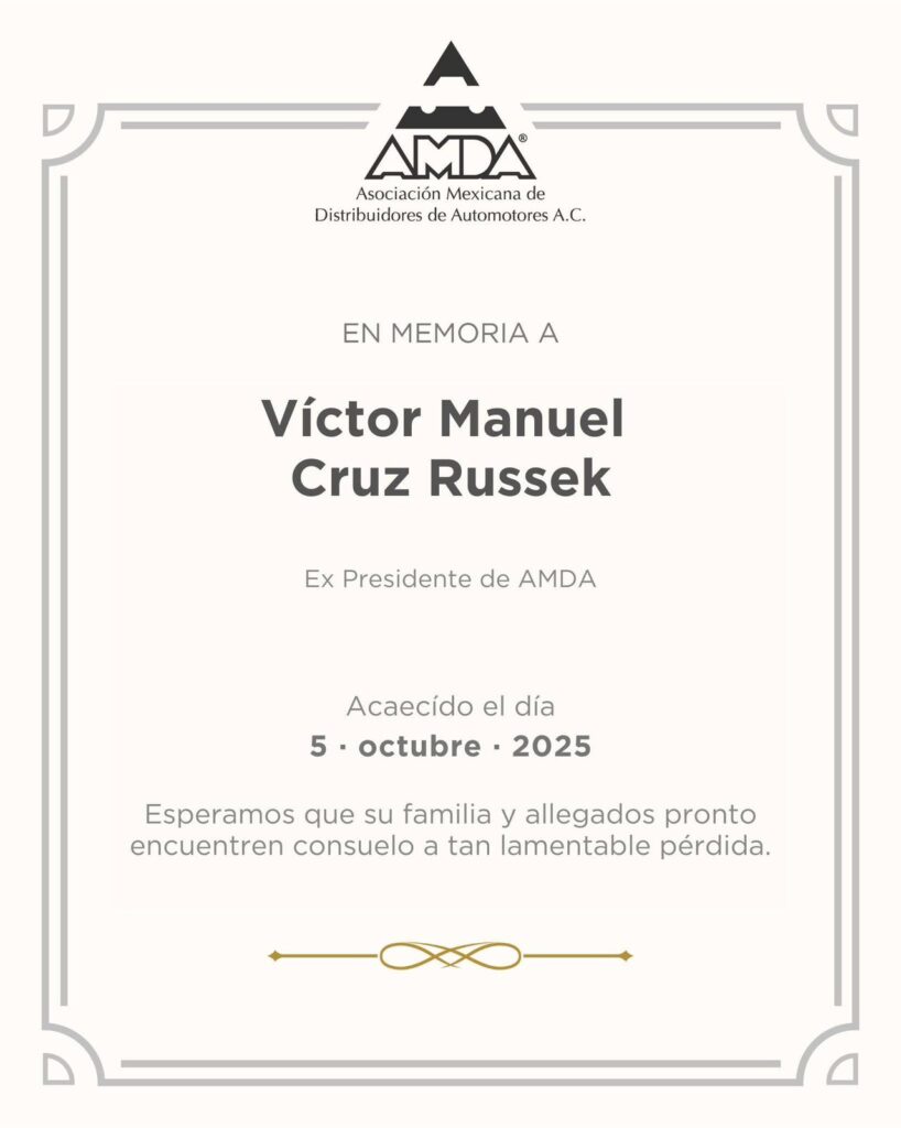 La Asociación Mexicana de Distribuidores de Automotores (AMDA) lamentó el fallecimiento de quien fue presidente de la delegación Chihuahua, reconociendo su legado al frente.