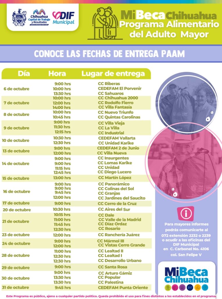 El Gobierno Municipal, por medio del DIF, informa a las y los beneficiarios del Programa Alimentario del Adulto Mayor (PAAM) edición 2025, las fechas en las que podrán acudir a su centro comunitario del 06 al 31 de octubre por su apoyo: