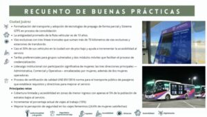 Como punto adicional se dio a conocer que existe una participación significativa de mujeres en el rubro de liderazgo institucional pues ellas ocupan las tres direcciones principales del JuárezBus y se cuenta con dos conductoras de unidades.