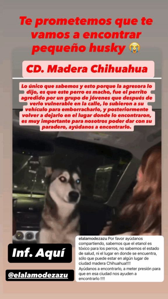 Tras compartir la información en su cuenta de Instagram, haciendo un llamado a las autoridades correspondientes de aquel municipio, y exigiendo a las jóvenes identificadas, Alejandra (quien grabó) y Denisse (daba de beber al perro), digan dónde quedó el huskey.