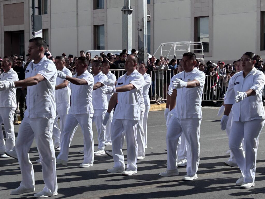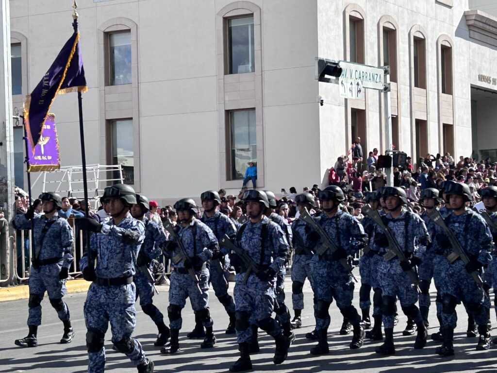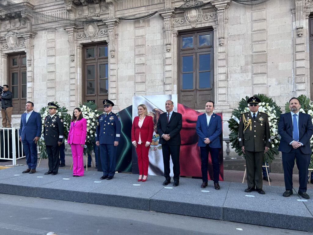 Frente a Palacio de Gobierno, por la avenida Carranza, la mandataria estatal, acompañada de autoridades civiles y militares realizaron una ofrenda floral a los héroes revolucionarios para posteriormente arribar al templete y contemplar el inicio del desfile.