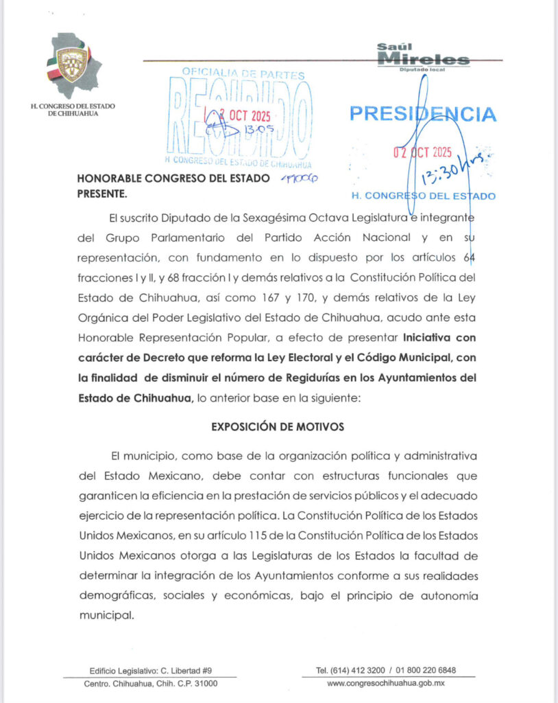 El pasado jueves 2 de octubre, el Grupo Parlamentario del Partido Acción Nacional (PAN) en el Congreso del Estado, presentó una iniciativa que busca reformar la Ley Electoral y el Código Municipal, con el objetivo de reducir el número de regidores en 65 de los 67 municipios de Chihuahua.