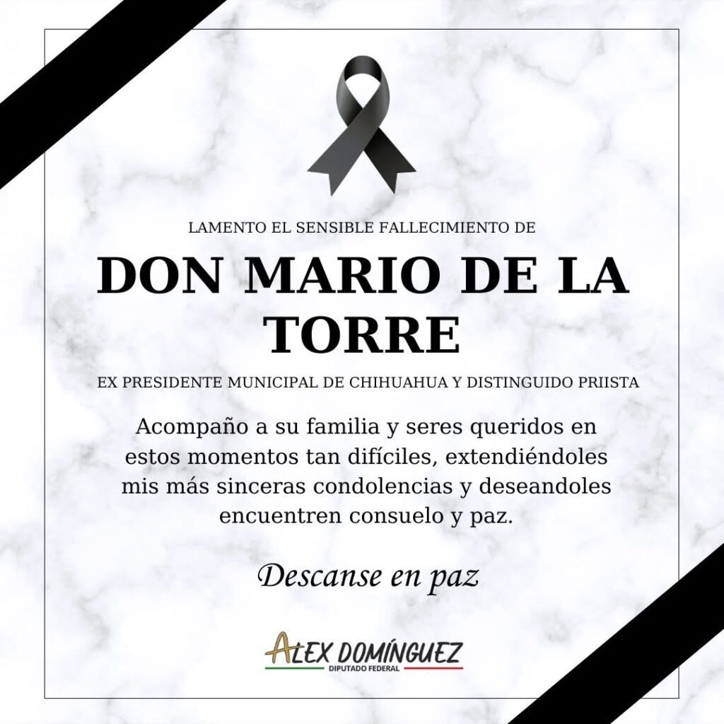 El exalcalde de Chihuahua, Mario De la Torre, falleció este viernes, por lo que de inmediato, políticos locales lamentaron su muerte.