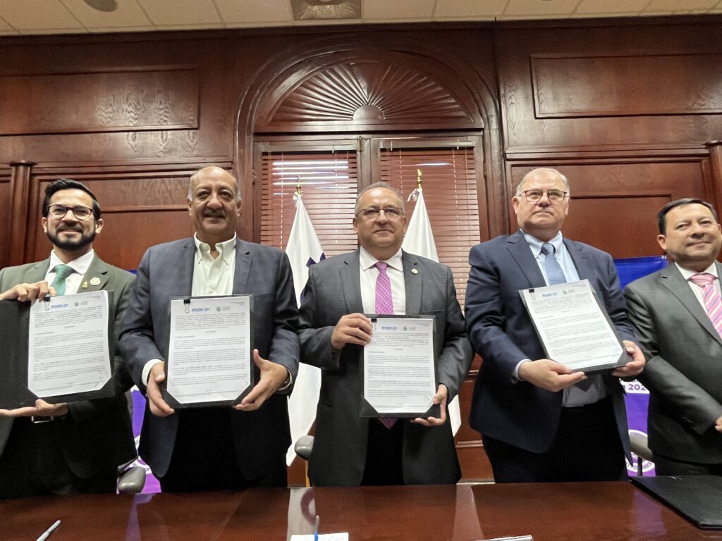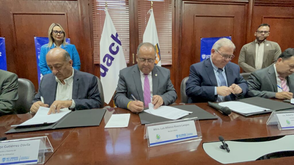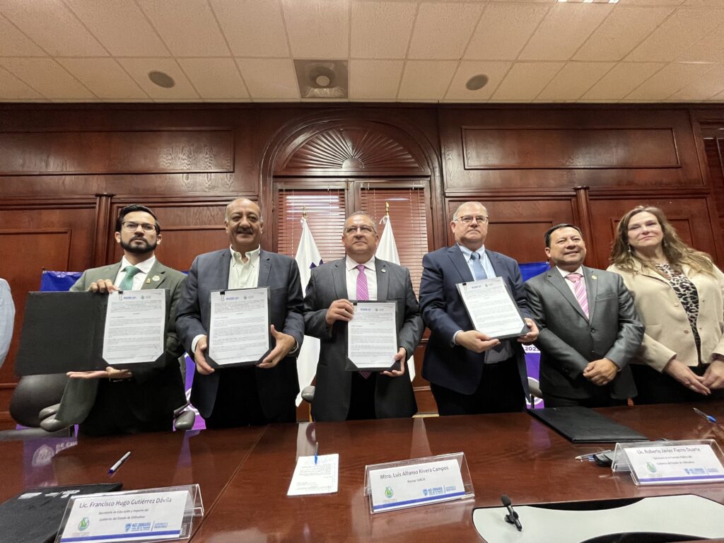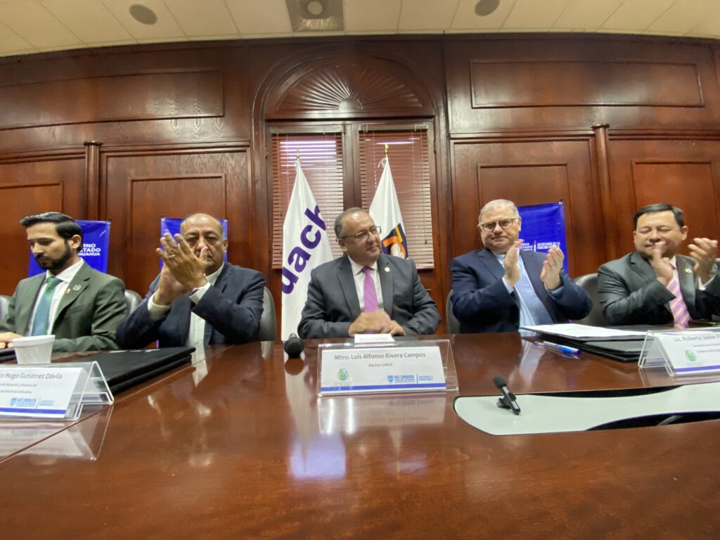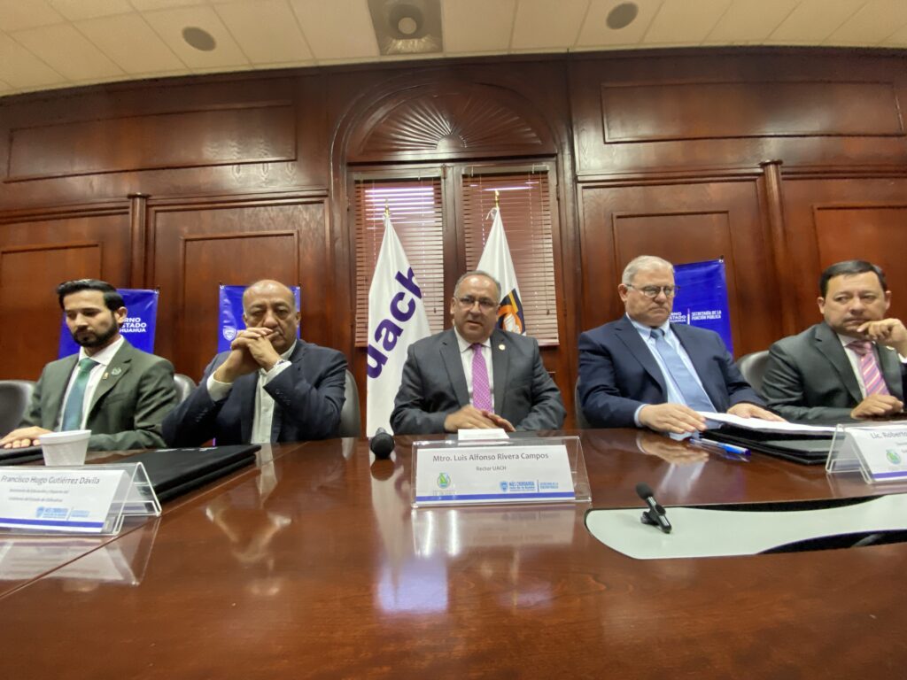 El rector de la Universidad Autónoma de Chihuahua (UACH) Luis Alfonso Rivera Campos en compañía del secretario de Educación y Deporte, Francisco Hugo Gutiérrez Dávila y el secretario de la Función Pública del Gobierno del Estado, Roberto Fierro Duarte realizaron la firma de convenio de colaboración educativa y capacitación de profesionalización.