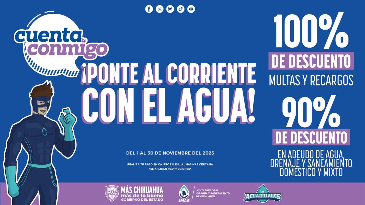 La Junta Municipal de Agua y Saneamiento (JMAS) de Chihuahua anunció el lanzamiento del programa “Ponte al Corriente con el Agua”, que ofrece descuentos a usuarios domésticos y comerciales con adeudos.