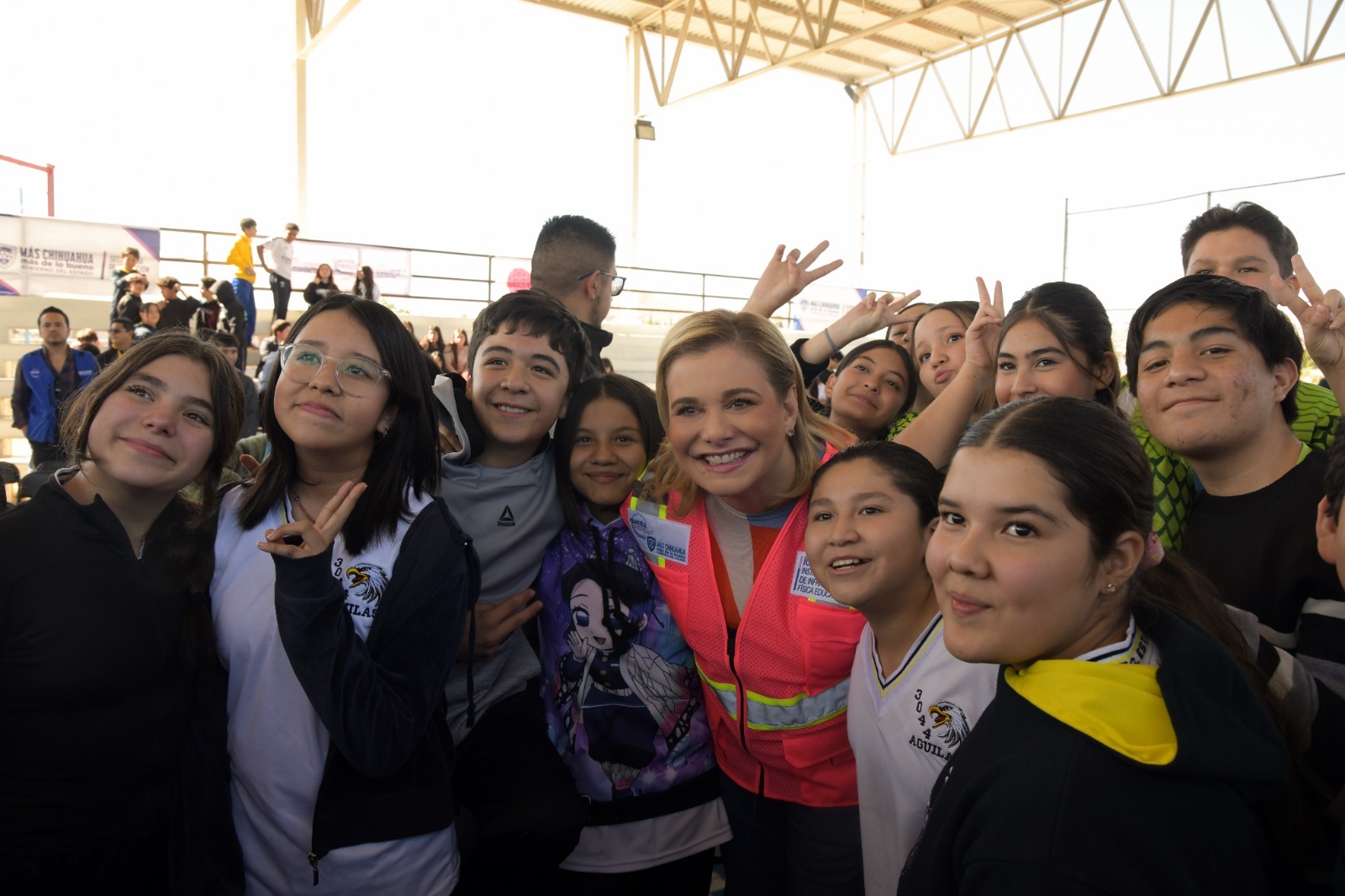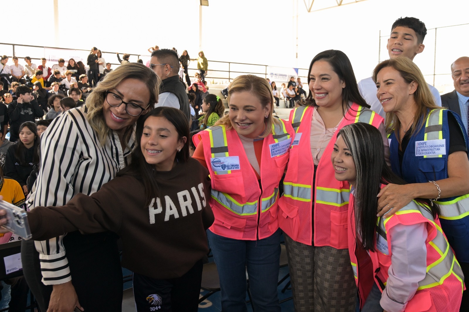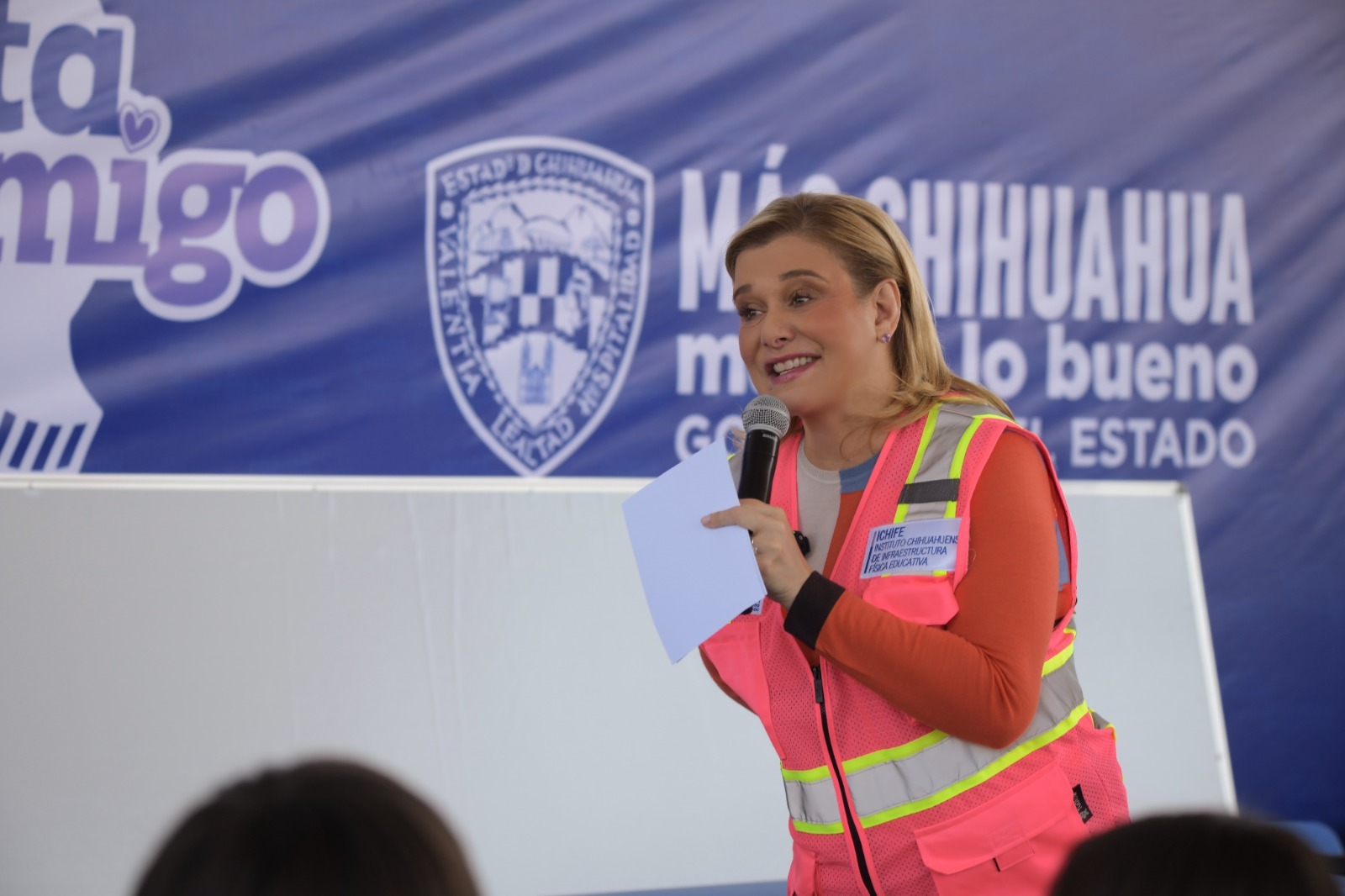 La gobernadora Maru Campos arrancó en la Escuela Secundaria 3044 de la ciudad de Chihuahua el Programa Juntos Construimos, con el que se mejorará la infraestructura de planteles de Educación Básica, en beneficio de 13 mil 989 estudiantes.
