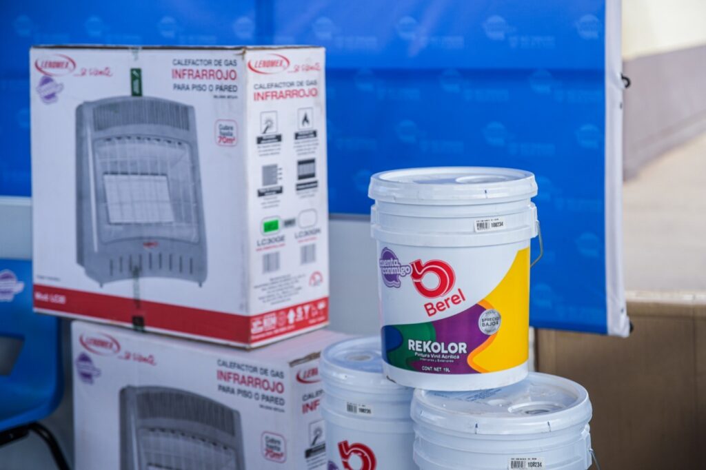 El material distribuido incluye calentones de leña y a gas, aparatos de aire evaporativo, luminarias, pupitres, mesas, sillas, pizarrones, tinacos, además de cubetas de pintura e impermeabilizante, en beneficio de 19 mil 700 alumnos de 36 planteles de la zona.