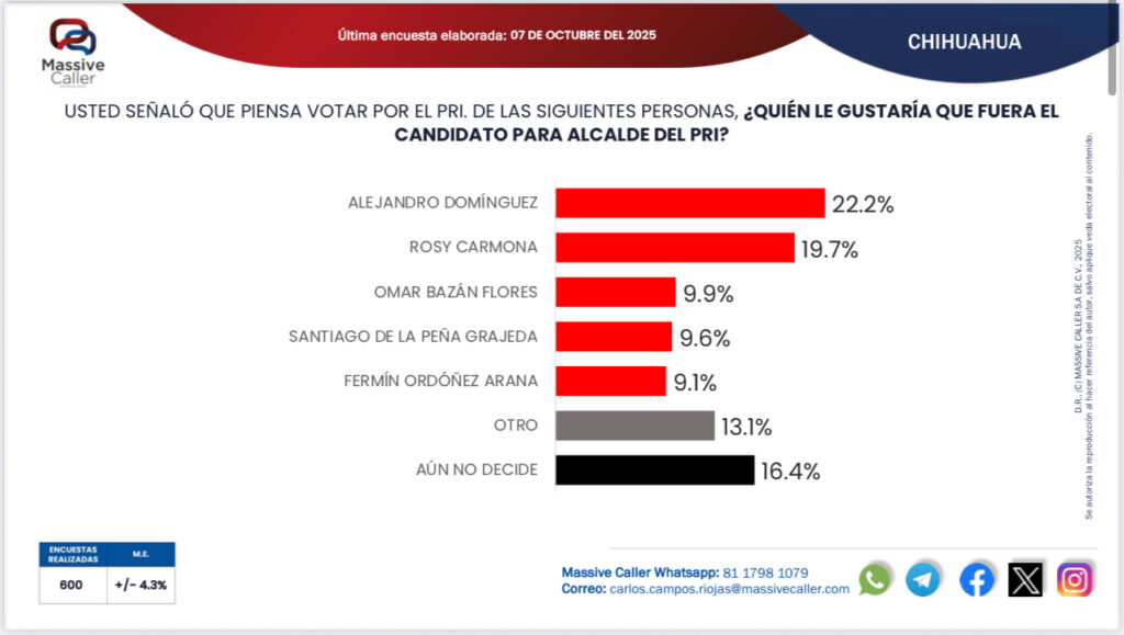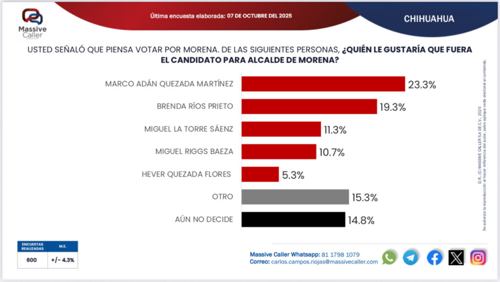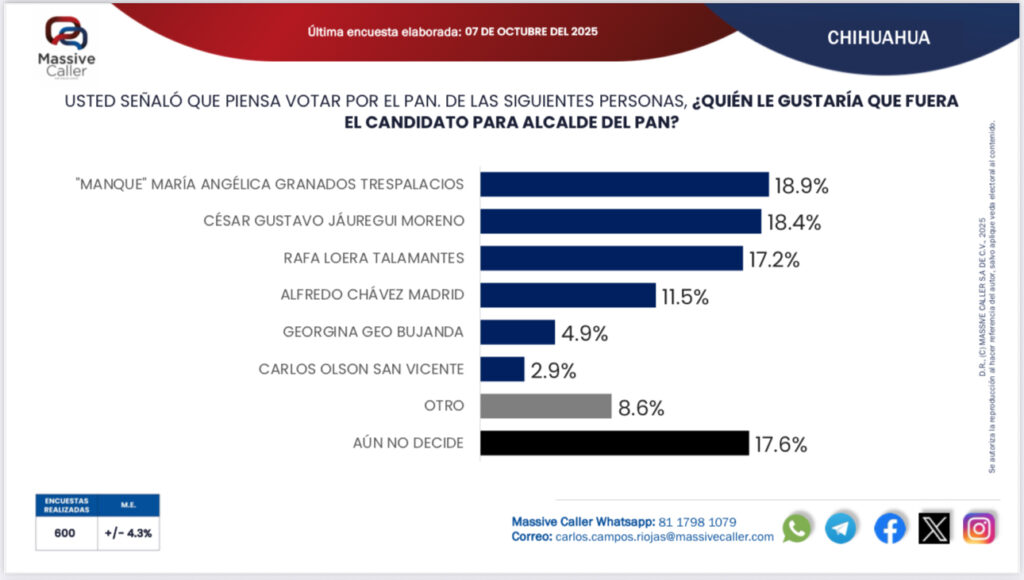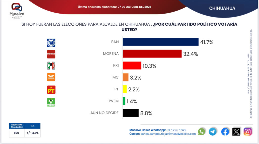 Massive Caller publicó su más reciente encuesta respecto a las preferencias electorales para la alcaldía de Chihuahua capital, en donde el PAN se mantiene en primer lugar, Morena en segundo y el PRI en tercero.