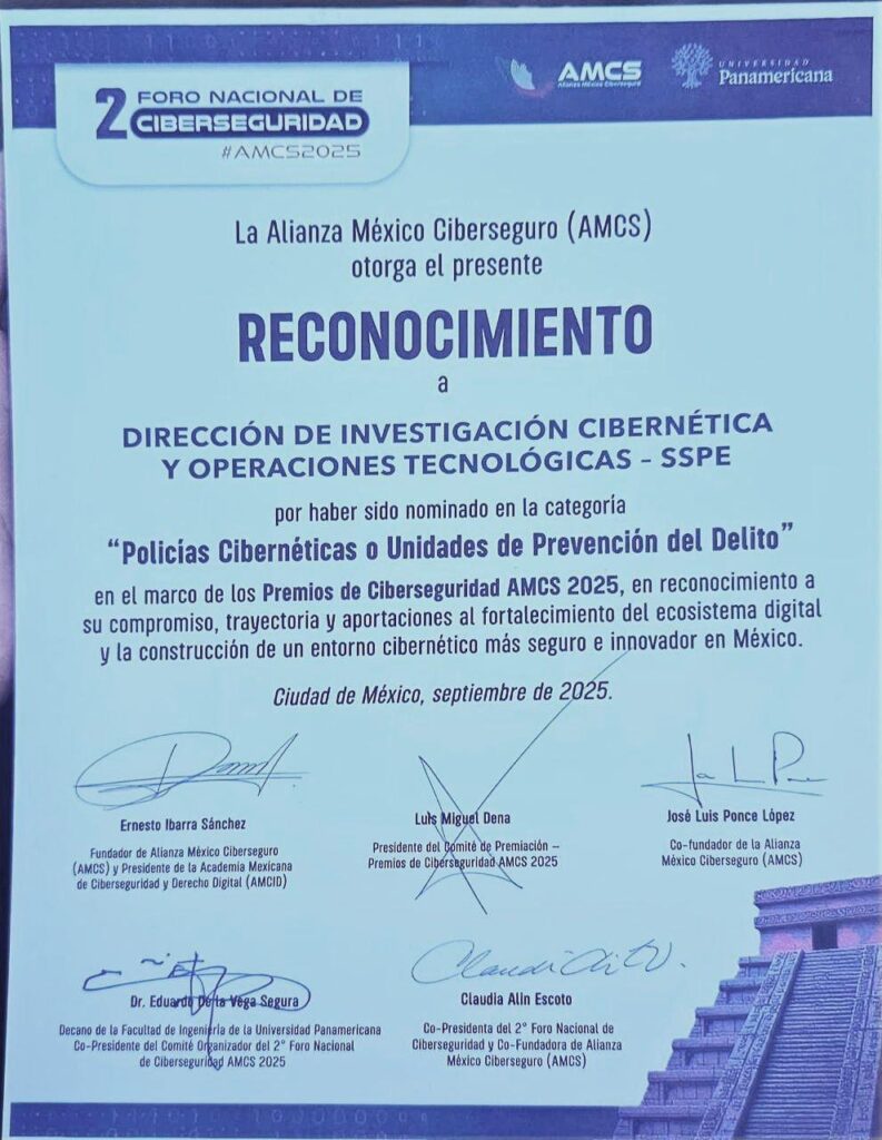 El reconocimiento fue entregado en el marco del Segundo Foro Nacional de Ciberseguridad, celebrado en la Universidad Panamericana Ciudad de México, donde participaron 46 unidades de policía cibernética de todo el país. Chihuahua se colocó en el Top 3 nacional dentro de la categoría “Policías Cibernéticas y Unidades de Prevención”.