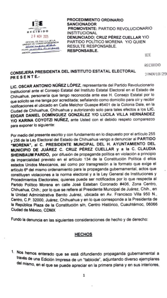 El Comité Directivo Estatal del Partido Revolucionario Institucional (PRI) presentó una denuncia formal ante el Instituto Estatal Electoral (IEE) en contra del C. Cruz Pérez Cuéllar y del partido Morena, por difundir propaganda gubernamental masiva e ilegal en diversos puntos de la capital del estado.