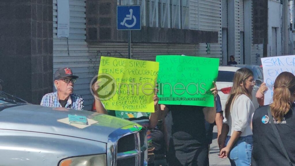En sus pancartas se muestran reclamos en contra del titular de la Procuraduría, Omar Velázquez Ortega por presuntamente no brindar atención a la población ante diversos casos de menores que están con padres sustitutos y no les dan una solución.