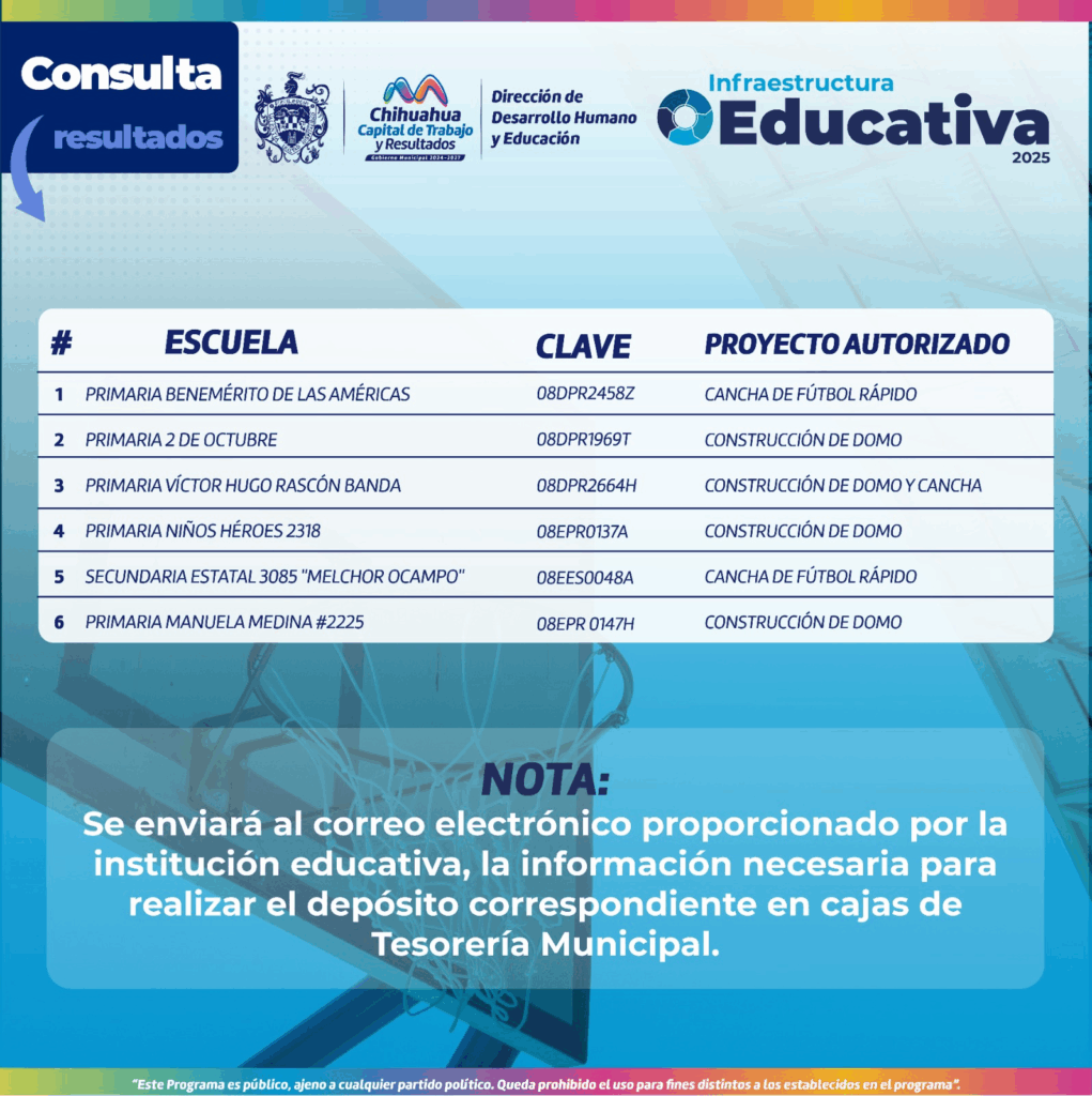 El Gobierno Municipal, por medio de la Dirección de Desarrollo Humano y Educación, da a conocer la tercera parte de la lista de las escuelas beneficiadas por el programa de “Infraestructura Educativa” en la edición 2025, para apoyar a las escuelas de Chihuahua capital para que tengan instalaciones dignas y de calidad.
