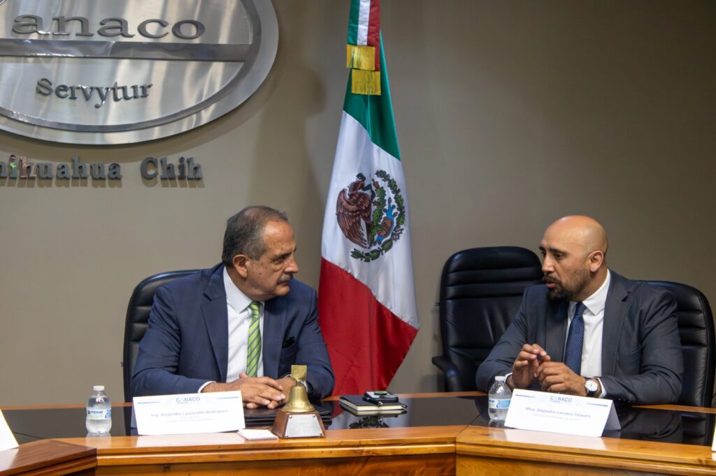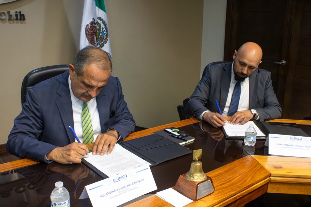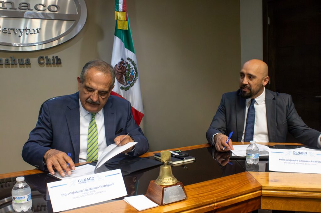 Durante el acto protocolario, celebrado en las instalaciones de la CANACO SERVYTUR Chihuahua, el Ing. Alejandro Lazzarotto Rodríguez, presidente de CANACO SERVYTUR Chihuahua, y el Mtro. Alejandro Carrasco Talavera, presidente interno de la Comisión Estatal de los Derechos Humanos de Chihuahua, encabezaron la firma del convenio, acompañados por la Dra. Diana Rodríguez Hernández, titular de la Unidad Distintivo Empresa Comprometida con los Derechos Humanos, y el Mtro. Gildardo Iván Félix Durán, secretario técnico ejecutivo.