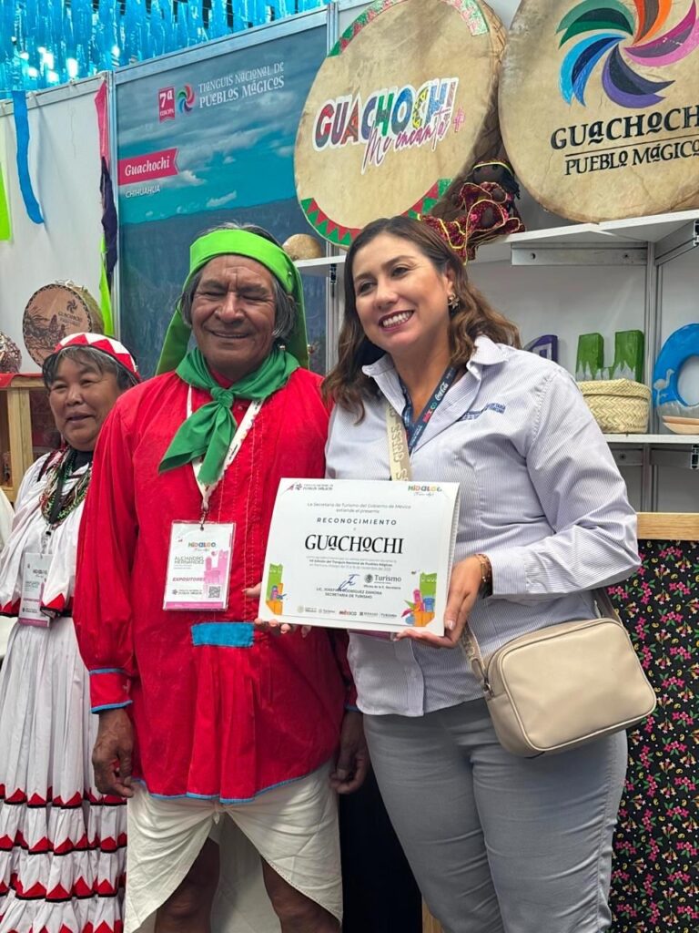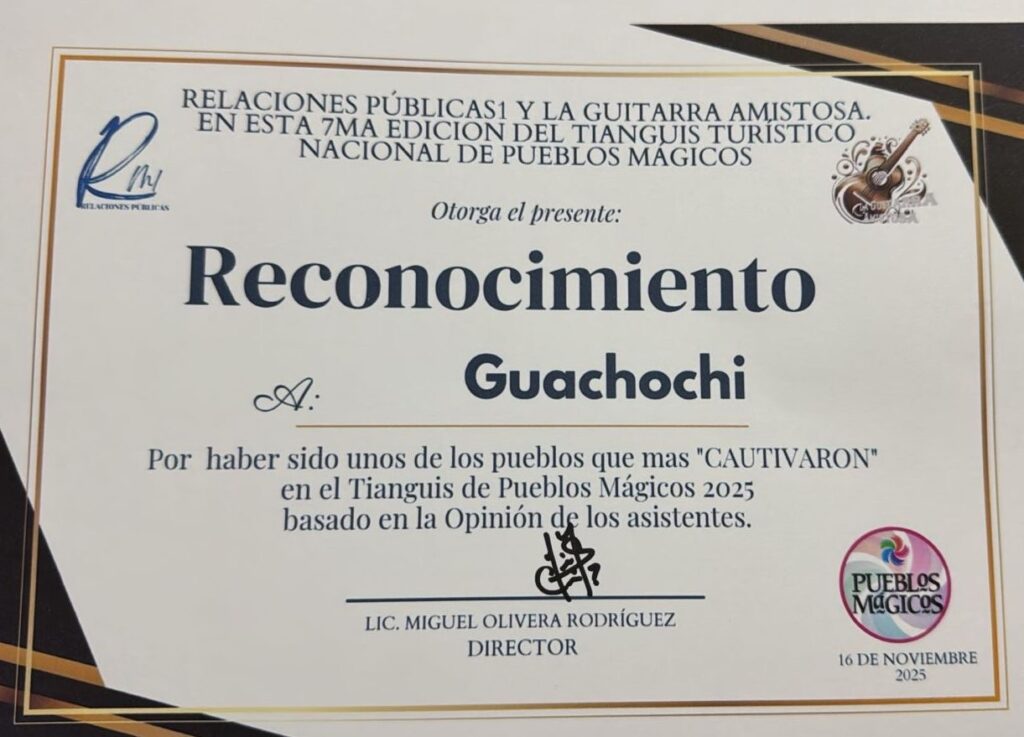El reconocimiento, otorgado por las organizaciones Relaciones Públicas 1 y La Guitarra Amistosa, fue entregado a Diana Angélica González, directora de Turismo de Guachochi, y Alejandra Villalobos Palacio, directora de Gestión Turística de Chihuahua, en representación del secretario de Turismo, Edibray Gómez Gallegos.