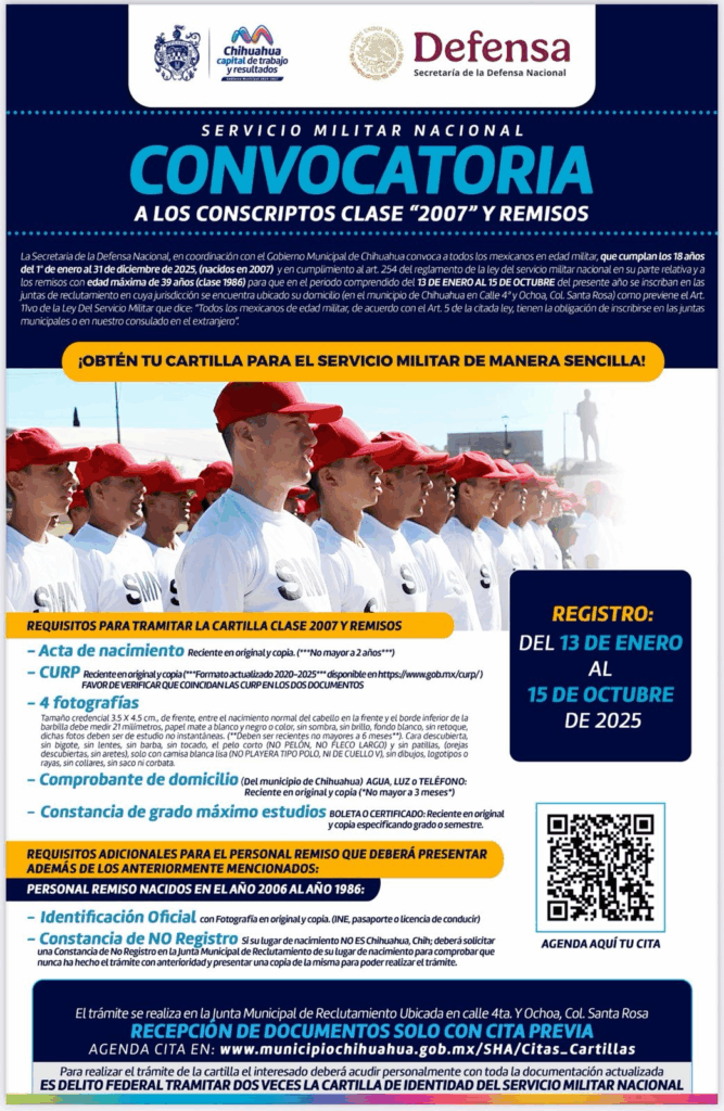 Pueden consultar la página para ver la información completa: https://www.municipiochihuahua.gob.mx/CCS/Convocatorias/CONVOCATORIA_A_LOS_CONSCRIPTOS_CLASE_2007_Y_REMISOS.