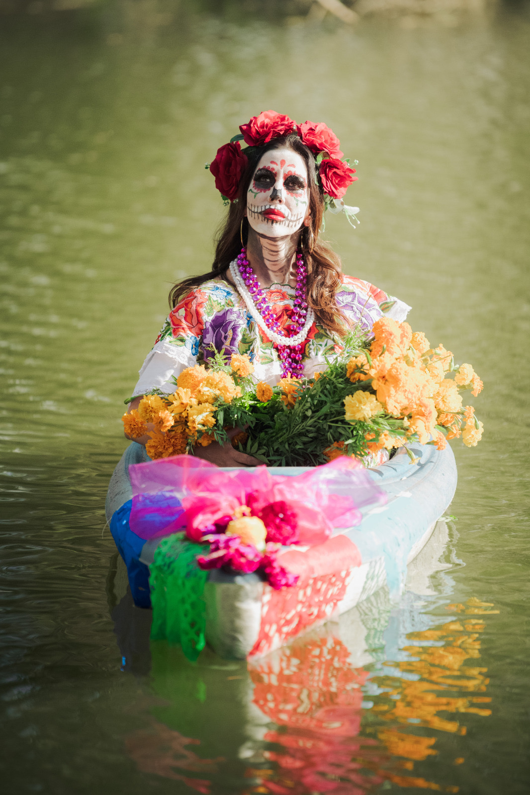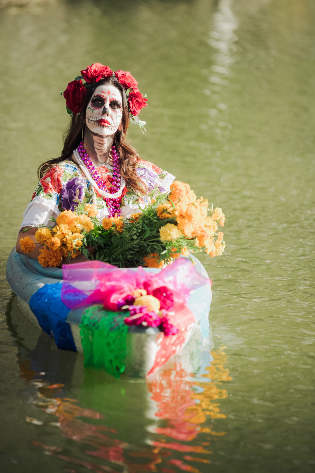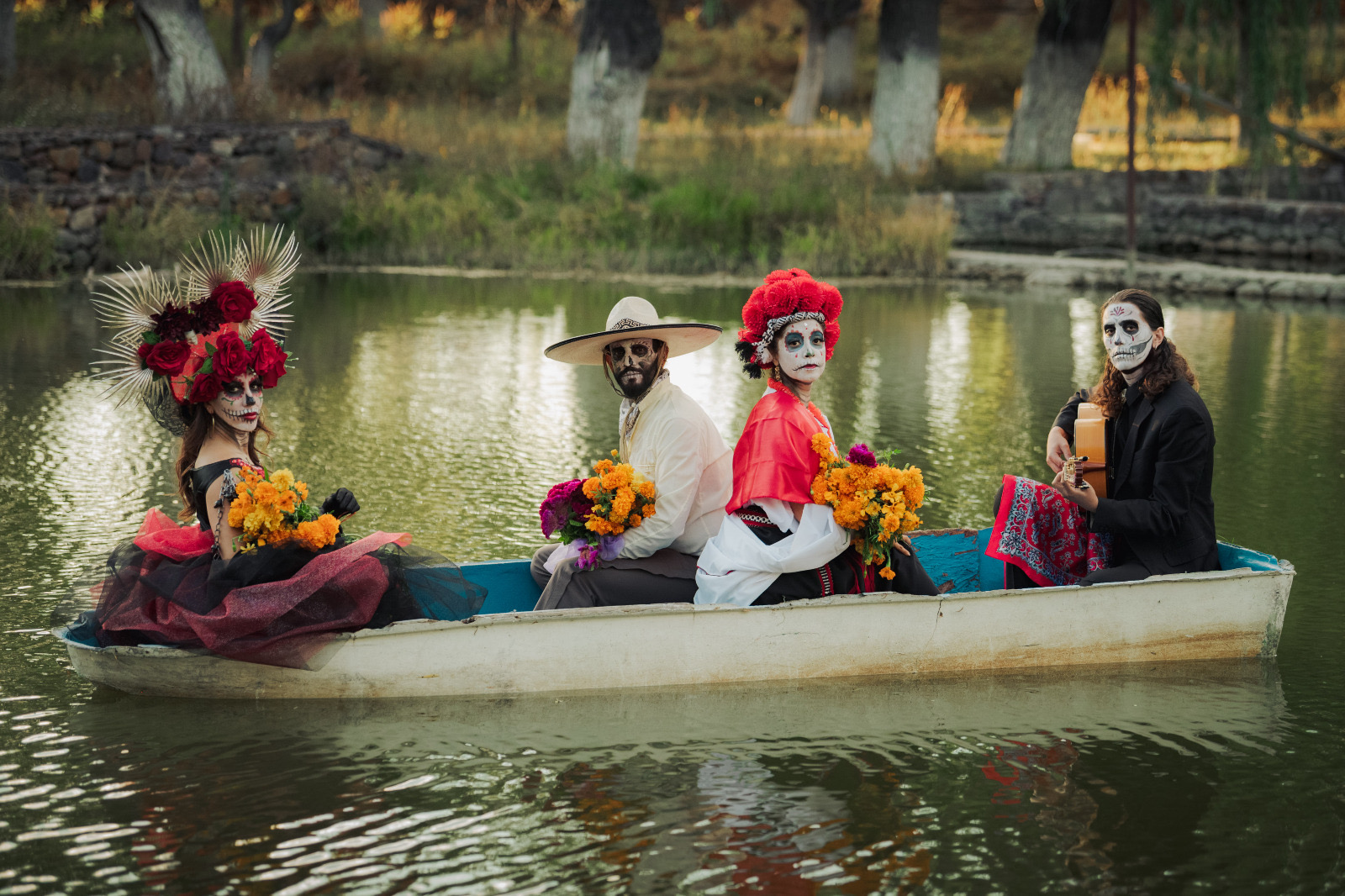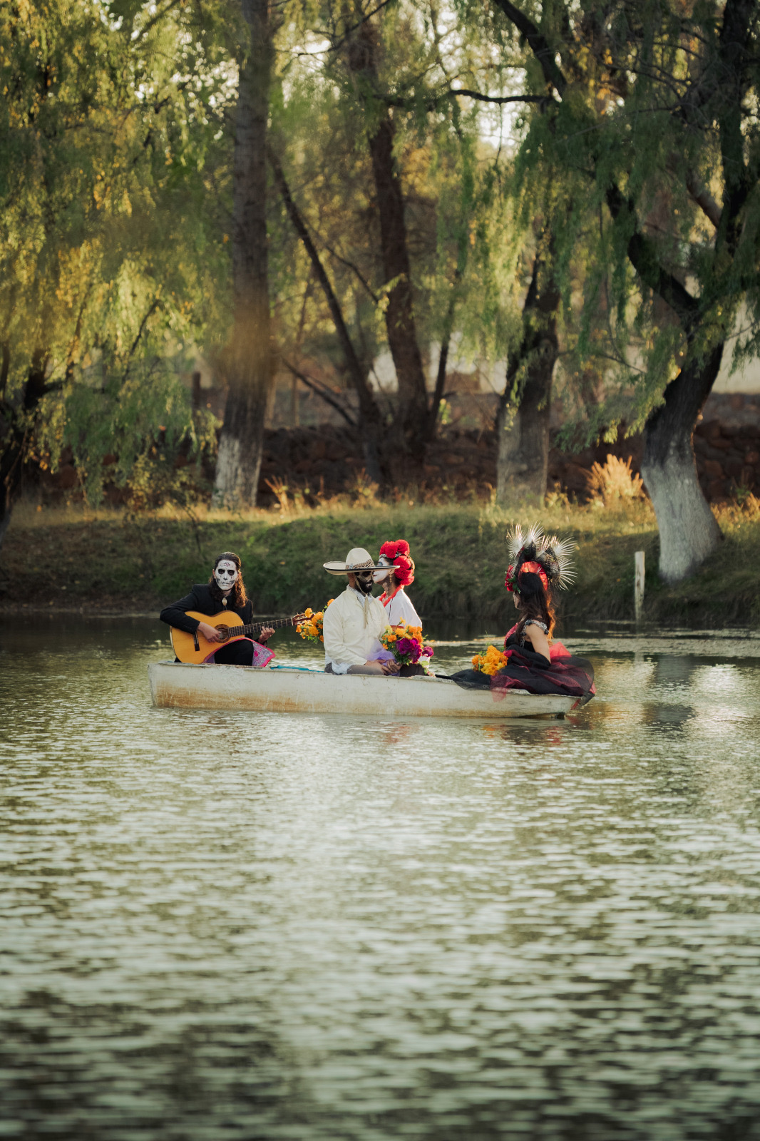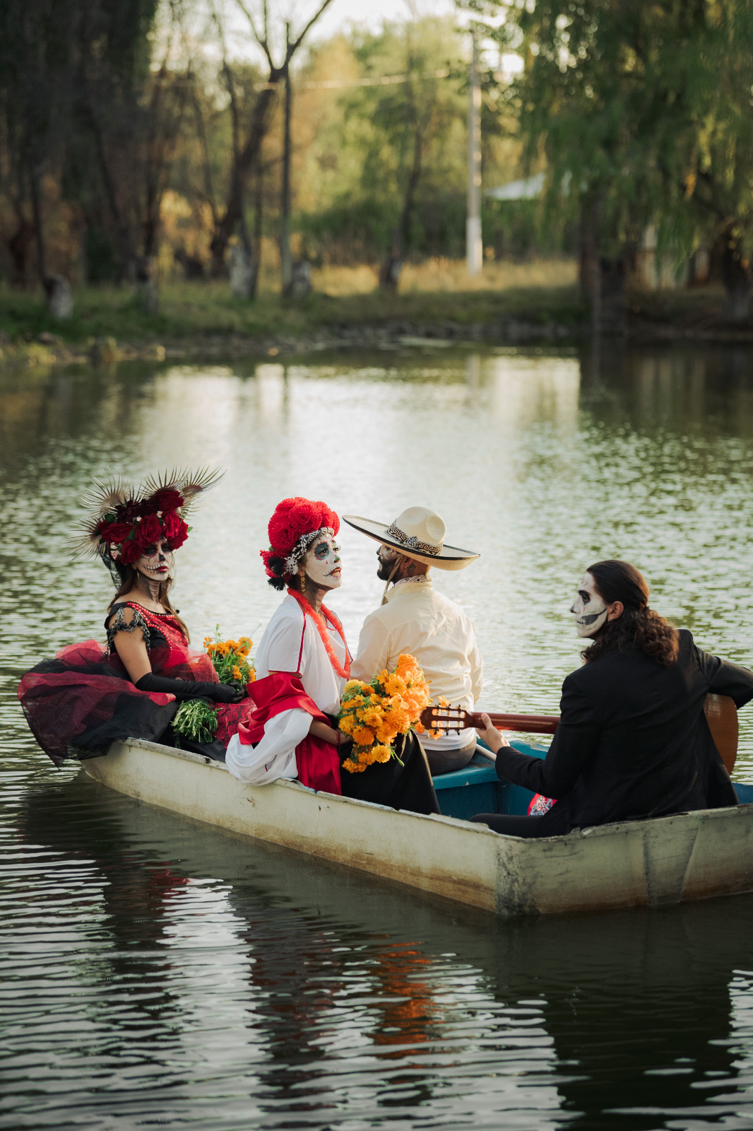 Durante la sesión, los participantes interpretaron la emblemática canción de «La Llorona» sobre una balsa, en medio de la laguna, lo que creó una escena cargada de simbolismo, que reforzó el mensaje de homenaje a la memoria y al arte.
