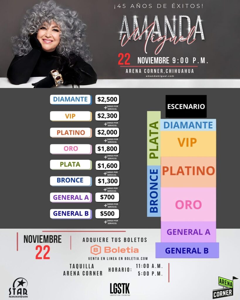👉En línea: https://amanda-miguel-en-chihuahua.boletia.com/ (más cargo por servicio):