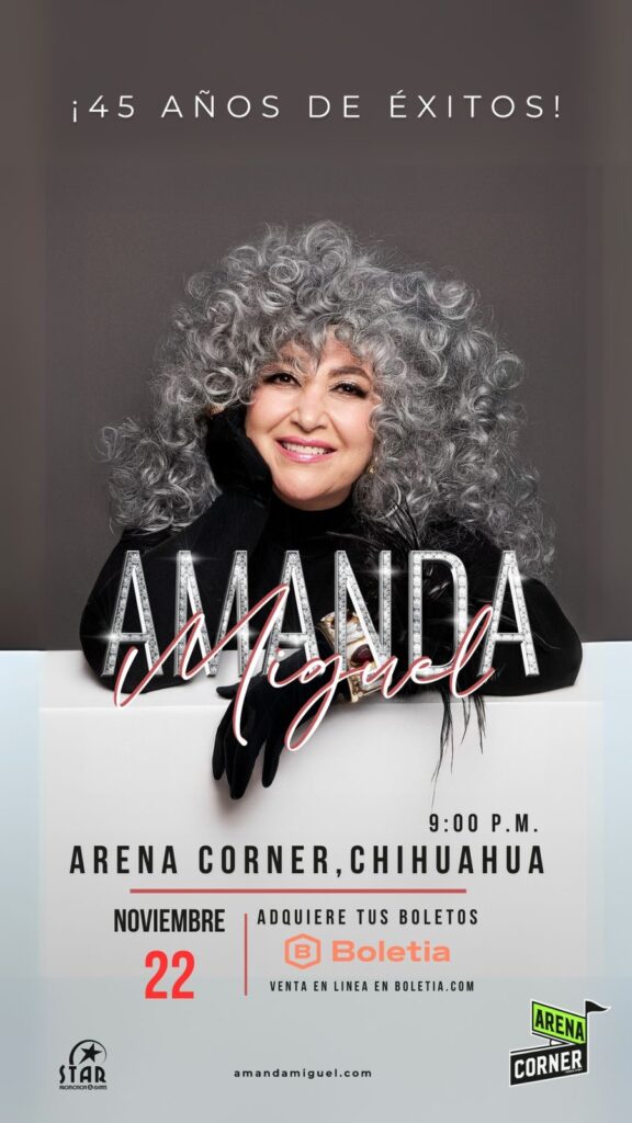 La cantante argentina Amanda Miguel realizará una presentación inolvidable en el Arena Corner Sport como parte de su gira en solitario Yo Soy “45 Años de Éxitos” Tour 2025 este próximo Sábado 22 de Noviembre en punto de las 21:00 hrs