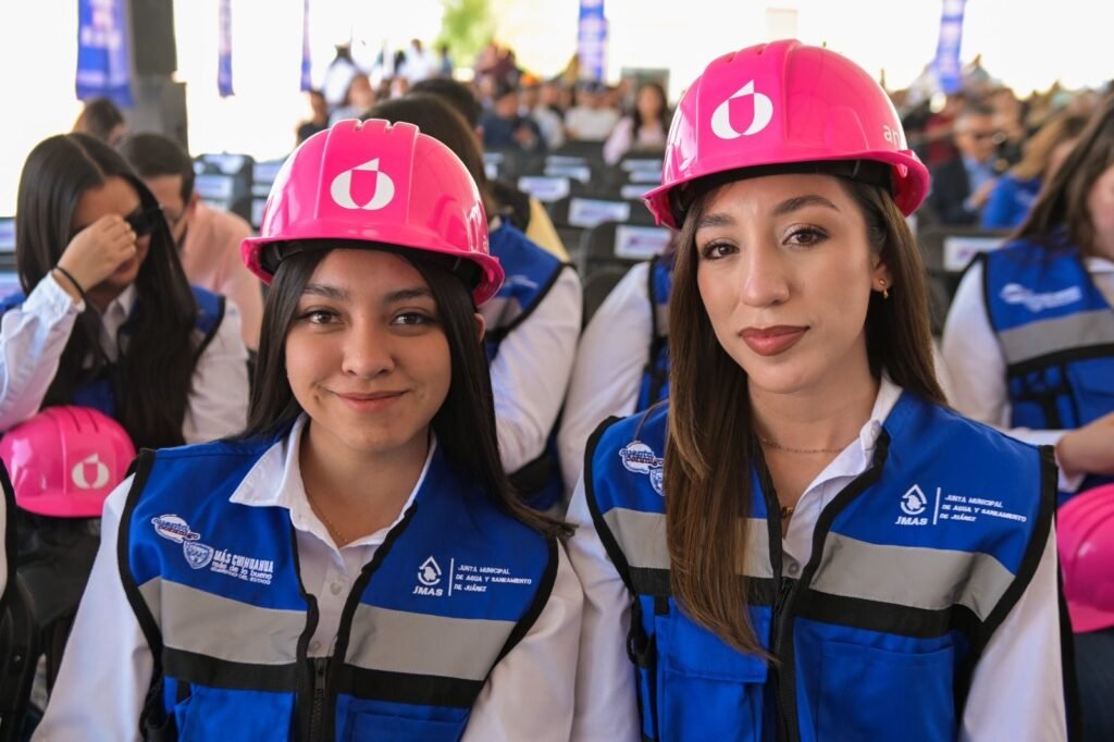 Como parte del evento, 50 colaboradoras de la Junta Municipal de Agua y Saneamiento (JMAS) rindieron protesta como nuevas integrantes del programa “Cascos Rosas”, iniciativa que impulsa la participación, capacitación y liderazgo de las mujeres en el sector hídrico.