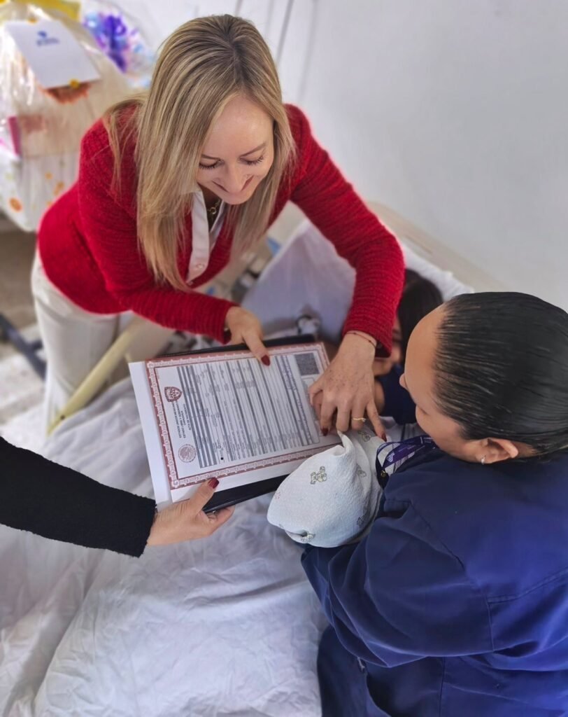 La coordinadora del Registro Civil en la Zona Norte, Karla Gutiérrez Isla, entregó de forma gratuita a la familia el acta de nacimiento y la CURP de la menor, para garantizar desde el primer día su identidad jurídica.