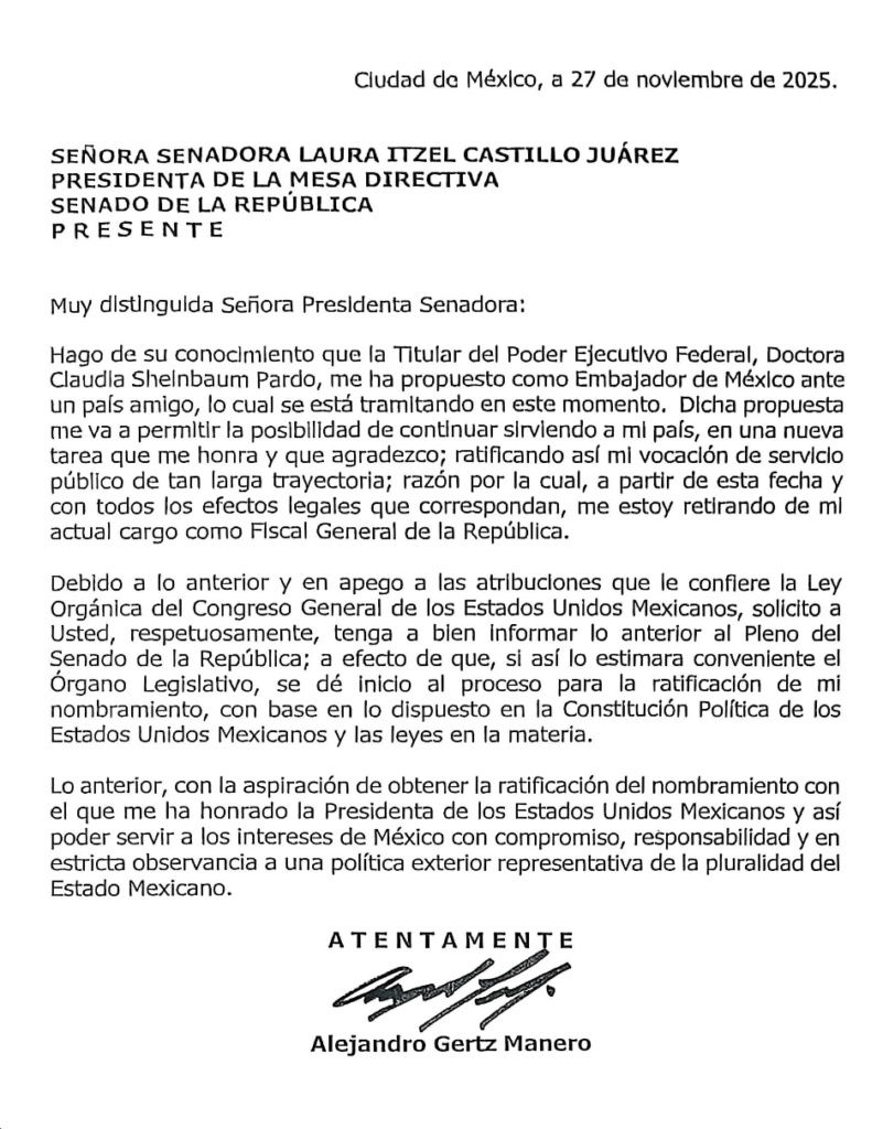 En una carta dirigida a Castillo Juárez, Gertz indicó que deja la titularidad de la FGR luego de aceptar la invitación de la presidenta Claudia Sheinbaum Pardo para ser embajador en “un país amigo”.