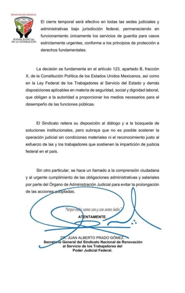 El Sindicato Nacional de Renovación al Servicio de los Trabajadores del Poder Judicial de la Federación llamó al urgente cumplimiento de las obligaciones administrativas y salariales por parte del Órgano de Administración Judicial para evitar la prolongación de las acciones adoptadas.