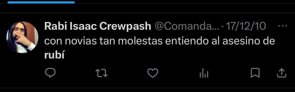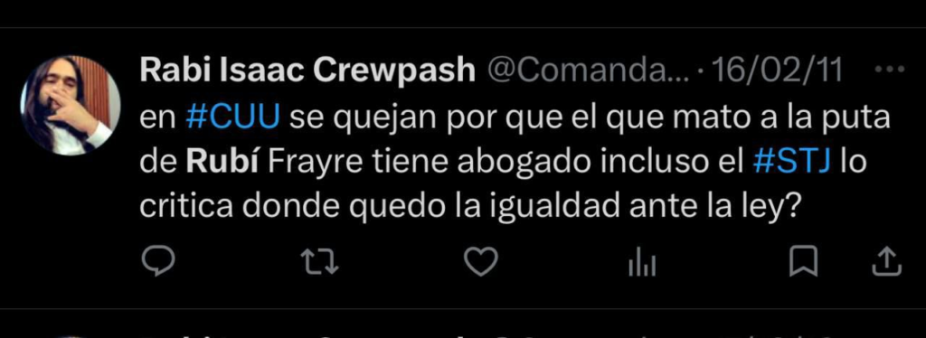 La regidora comenzó con decir que la diputada de Morena, pidió hace tiempo que uno de los puentes que están construyéndose, se le nombrara en memoria de la activista Marisela Escobedo, pero por otra parte su asesor apodado “Chupa”, posteó en su cuenta @ComandanteChupa: en #cuu se quejan porqué el que mató a la puta de Rubí Frayre tiene abogado incluso el #STJ lo critica, donde quedó la igualdad ante la ley?