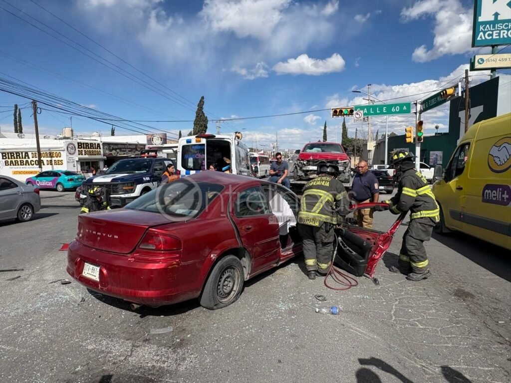Mujer omite luz roja y provoca choque en la Flores Magón, dos adultos mayores atrapados en vehículo