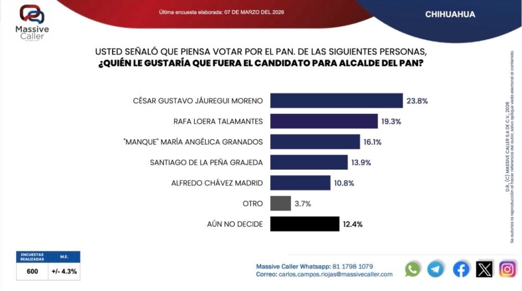 Massive Caller publicó este lunes su más reciente encuesta respecto a las preferencias electorales para la alcaldía de Chihuahua capital, en donde el PAN como partido político se mantiene en primer lugar con el 43.6 por ciento, mientras que Morena sigue en segundo con el 33.8 por ciento de las preferencias y el PRI en tercer lugar, con el 8.3 por ciento.